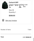 The Carhartt WIP Layton Jacket (Discovery Green / Discovery Green), which I bought from Farfetch .com. I only worn it 4-5 times, so it seems like new one. It's size m, chest 45inch, length 29inch,sleeve length 25inch.I attcach the detail from official website below: Detail: The Carhartt WIP Layton Jacket puts a premium workwear twist on cold weather protection with an uncompromising classic aesthetic. This vintage design is equipped with quilted chambers as well as midweight padding. Carhartt WIP Layton Jacket - features: • high-necked collar • hidden metal front zipper with custom pull and snap button closure at exterior storm flap plus additional interior storm flap • Carhartt script logo embroidered at left chest • 2 welt pockets at lower front • drawstring-adjustable bottom hem with sturdy eyelets and toggles at the elastic draw cord • stretch cuffs • interior chest pocket with hook and loop fastener at wearer's left • regular fit • shell: 98% cotton, 2% spandex corduro • lining: 100% nylon • insulation: 100% polyester