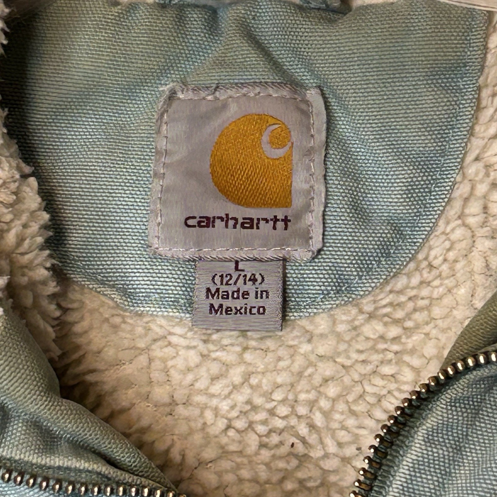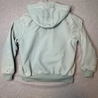 The Carhartt Sherpa Lined Duck Canvas Jacket in women's size L (12/14) is a durable and stylish outerwear option in light blue. Made with cotton duck canvas, this mid-length jacket features long sleeves and a cozy sherpa lining for added warmth. The jacket is suitable for various occasions including travel, casual wear, and workwear, with a regular fit and practical features like zipper and drawstring closures. Perfect for the winter, fall, and spring seasons, this classic jacket carries a nostalgic theme inspired by the USA, chores, farm, outdoor activities, and a timeless style.