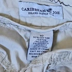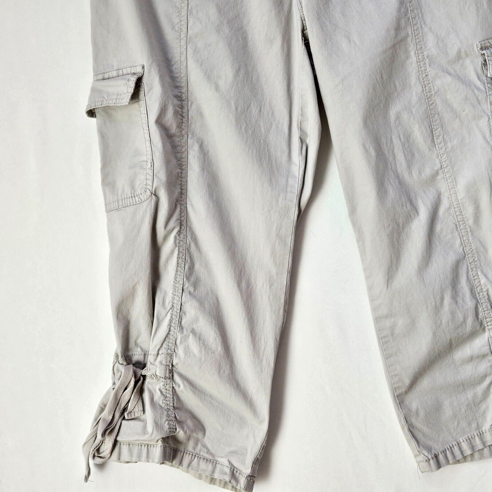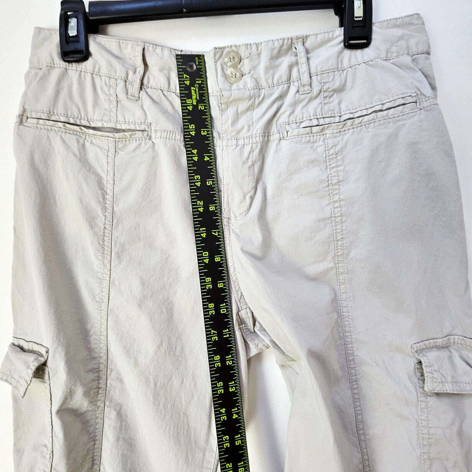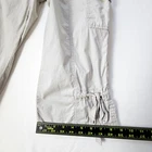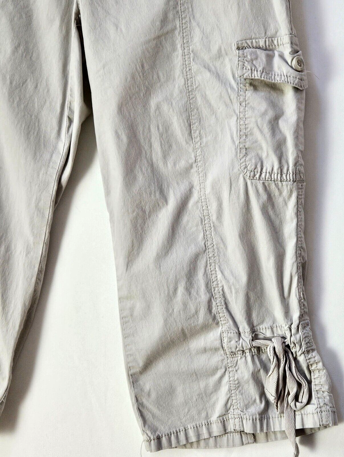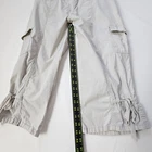 97% cotton 3% spandex cargo pockets drawstring ankles double button with zip closure color is an off white very light beige. cropped pants are in very good clean solid condition. womens SZ 10 measures flat 15" across waist 10" rise 19" inseam