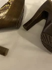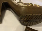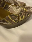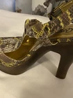 Faux leather snakeskin print Size 7.5 Platform multi color (tan, gray, &green) Buckle closure 4” heels Used in great condition
