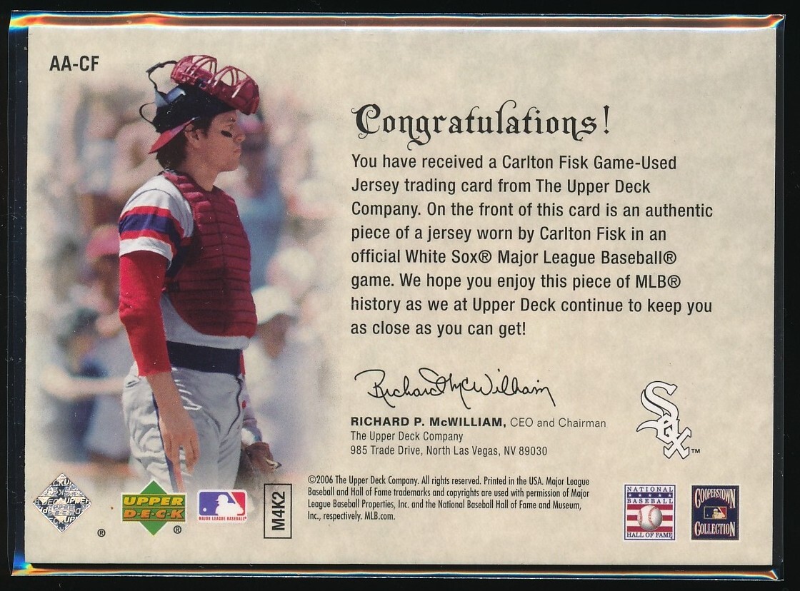 Carlton Fisk 2006 Upper Deck Artifacts Jumbo Game Used Jersey 34/45! Shipping is $4.50. Card will be shipped USPS First Class Mail. I will combine shipping at $0.50 per additional card purchased. Please see my other items for more great listings.