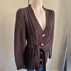 Sz S Brown cardigan Cable knit Acrylic material Light wear to the fabric, in great condition Approx measurements laying flat Length 29” Pit-Pit 19” (stretches a bit more if needed)