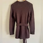 This cozy chocolate brown cardigan is a timeless staple! The cable knit adds classic charm, and the button-front design with a belt gives it a polished look. Super soft and stretchy for a comfortable fit, yet still flattering. Lightweight but warm enough for layering—perfect for chilly days. The condition is excellent, with only minor wear. A versatile piece that pairs easily with jeans or dresses!