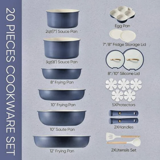 This cookware set is a game-changer! The nonstick surface makes cooking and cleanup effortless, while the detachable handles save so much space. Love the vibrant blue color—it brightens up my kitchen. The pans heat evenly and work perfectly on my induction stove. Oven-safe and durable, this set has everything I need for everyday meals. Highly recommend for anyone wanting stylish, functional cookware!