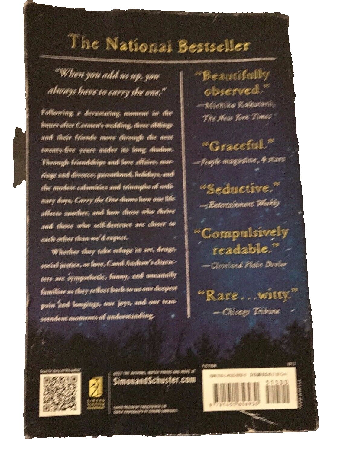 "C arry the One begins in the hours following Carmen’s wedding reception, when a car filled with stoned, drunk, and sleepy guests accidentally hits and kills a girl on a dark country road. For the next twenty-five years, those involved, including Carmen and her brother and sister, craft their lives in response to this single tragic moment. As one character says, “When you add us up, you always have to carry the one.” Through friendships and love affairs; marriage and divorce; parenthood, holidays, and the modest calamities and triumphs of ordinary days, Carry the One shows how one life affects another and how those who thrive and those who self-destruct are closer to each other than we’d expect. As they seek redemption through addiction, social justice, and art, Anshaw’s characters reflect our deepest pain and longings, our joys, and our transcendent moments of understanding. This wise, wry, and erotically charged novel derives its power and appeal from the author’s exquisite use of language; her sympathy for her recognizable, very flawed characters; and her persuasive belief in the transforming forces of time and love." Paperback, pre-owned, fair condition, Edge and page wear. See images.