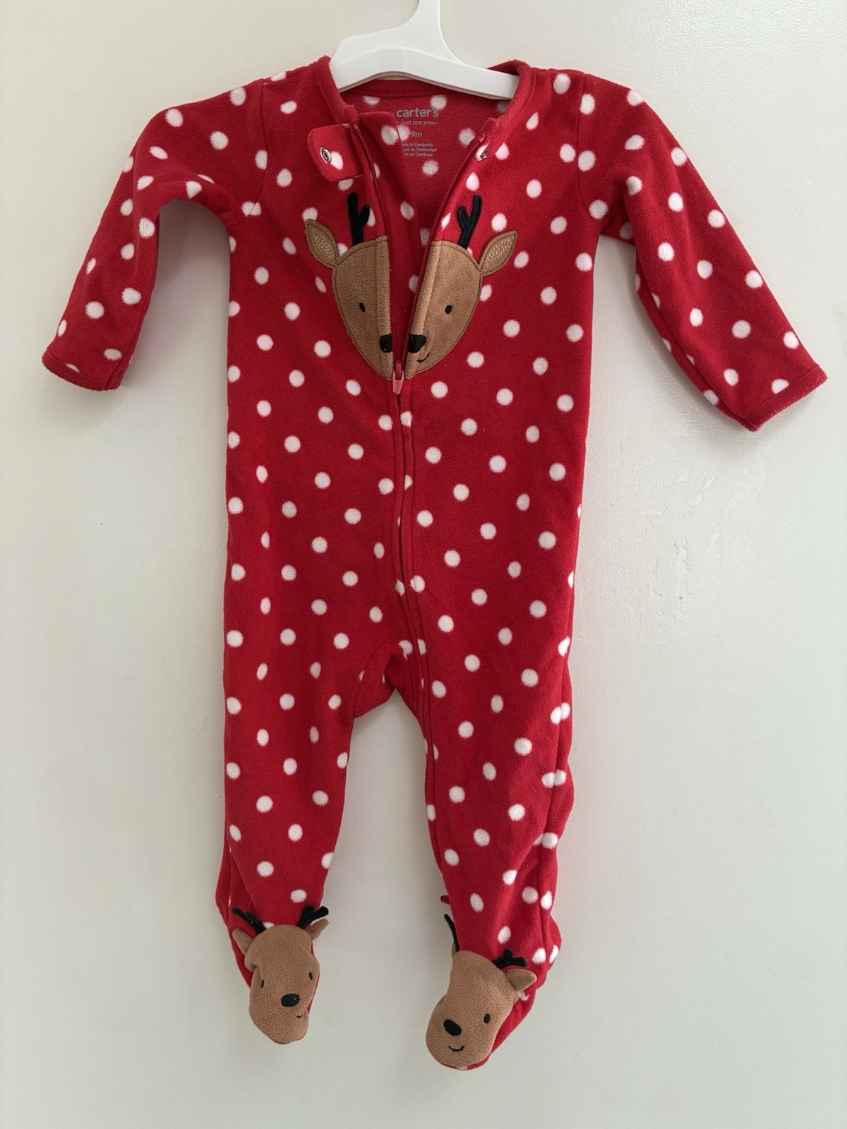 Carter's Baby Girl 1-Piece Cute Reindeer Polka Dot Christmas Sleep & Play Red 9M. Condition is pre-owned. Smoke free, pet free home. Shipped via USPS Ground Advantage. In very good condition. Free of rips or stains.