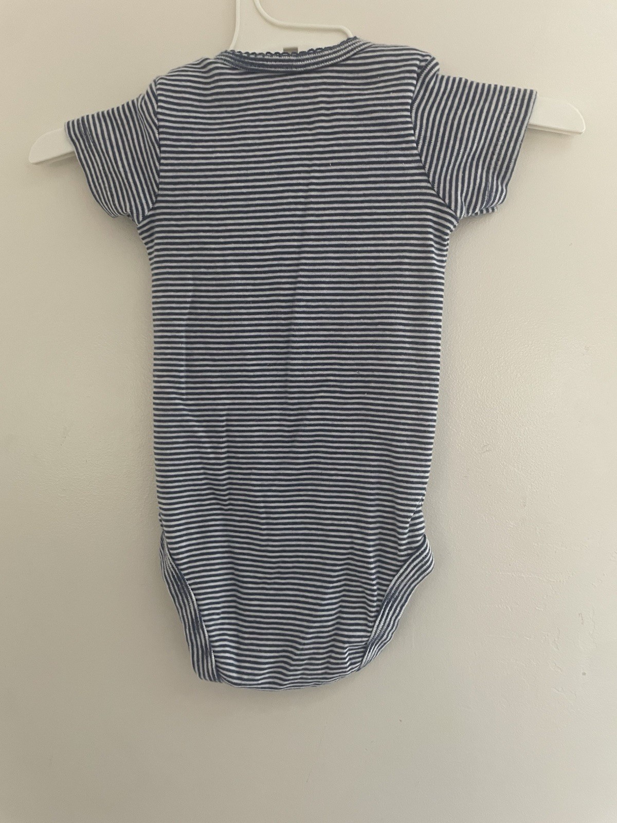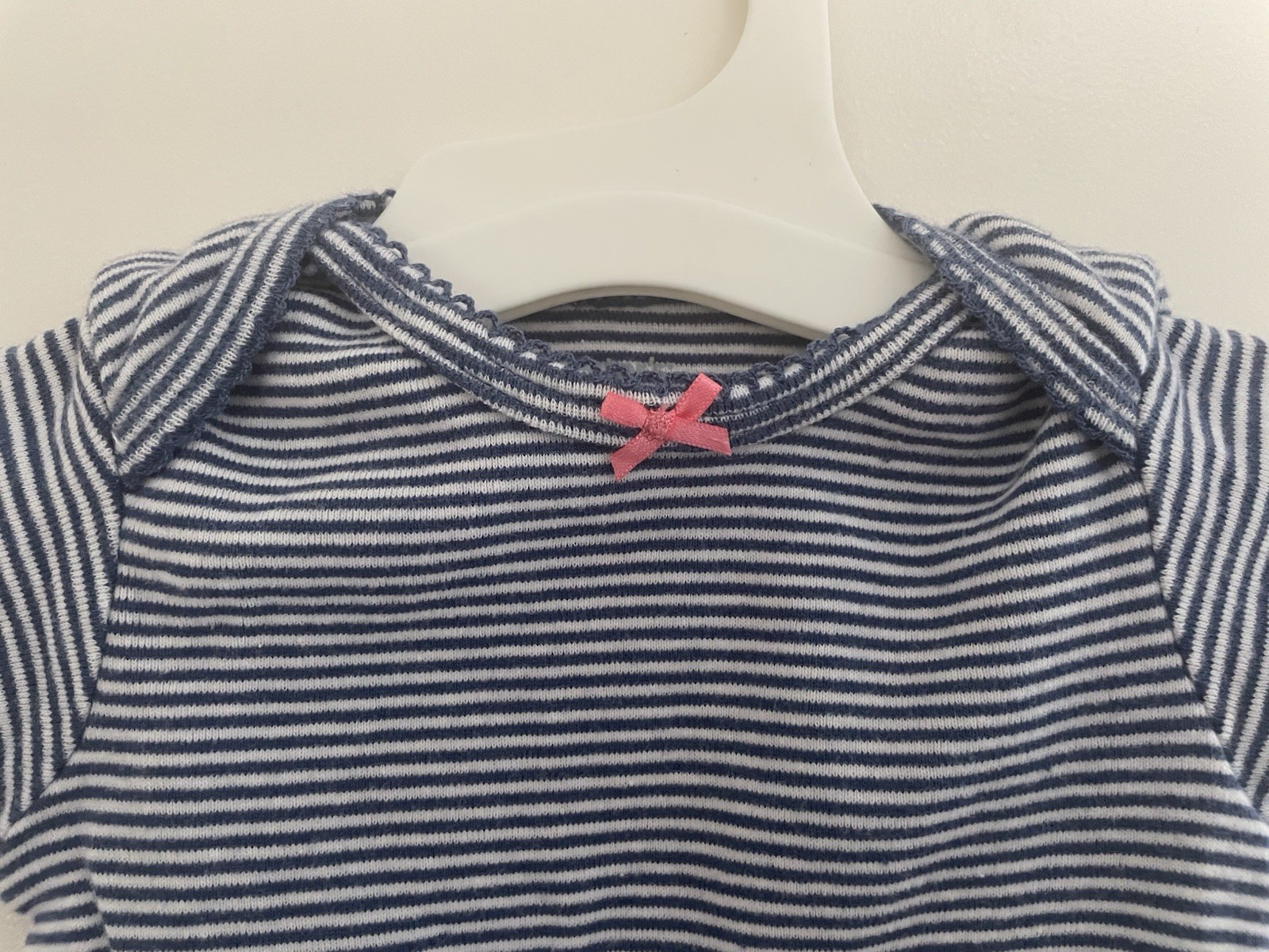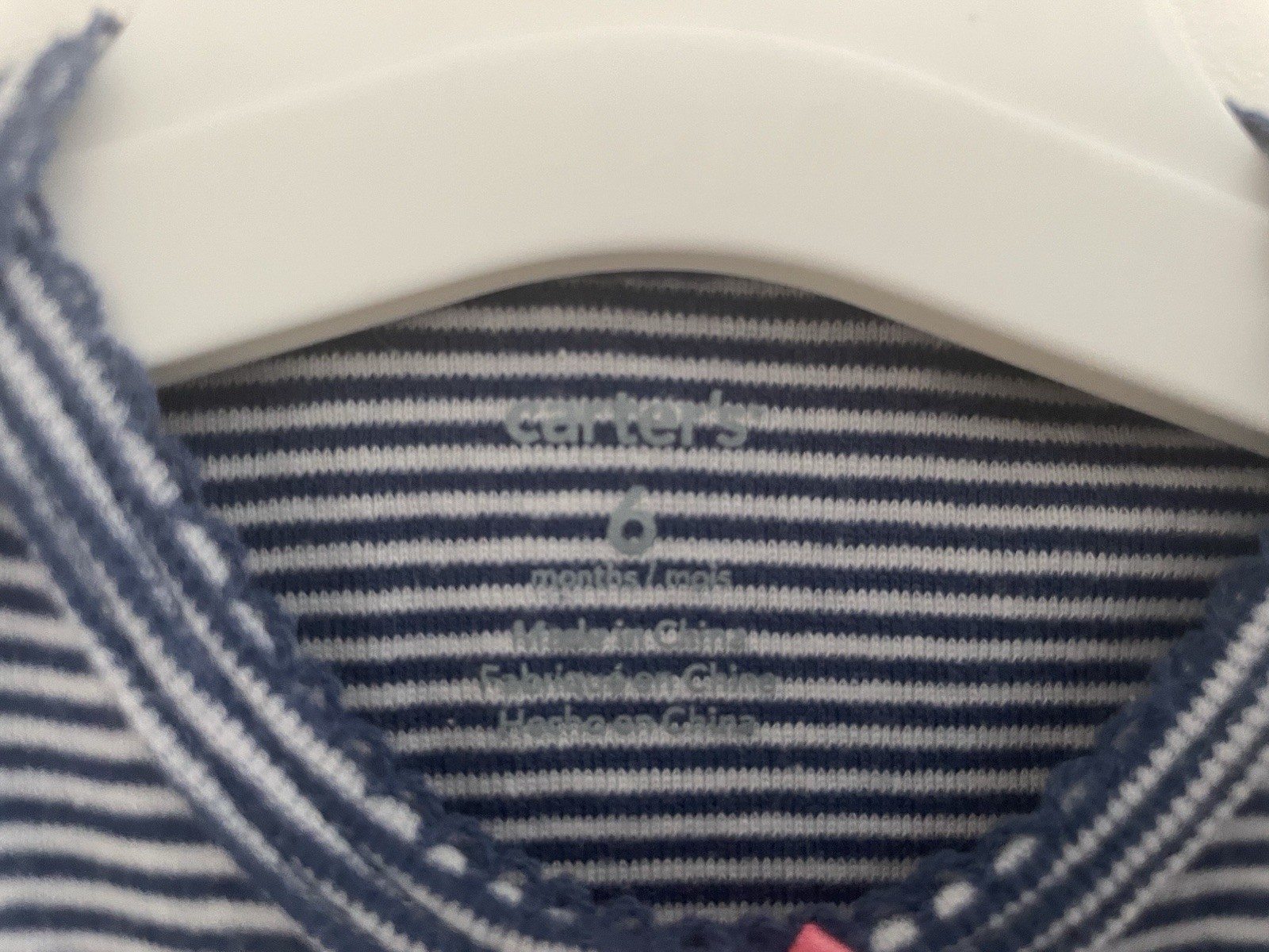 Type: One-Piece Season: Fall, Spring, Summer Occasion: Casual Features: Comfort, Easy Care, Lightweight, Stretch Sleeve Length: Short Sleeve Set Includes: Bodysuit Style: Bodysuit Size: 6 Months Pattern: Striped Material: 100% Cotton Garment Care: Machine Washable Country of Origin: China Number of Pieces: 1 Piece Department: Girls Closure: Snap Color: Blue Accents: Bow, Lace Brand: Carter's Seller Notes: “In very good condition. Free of rips or stains.”