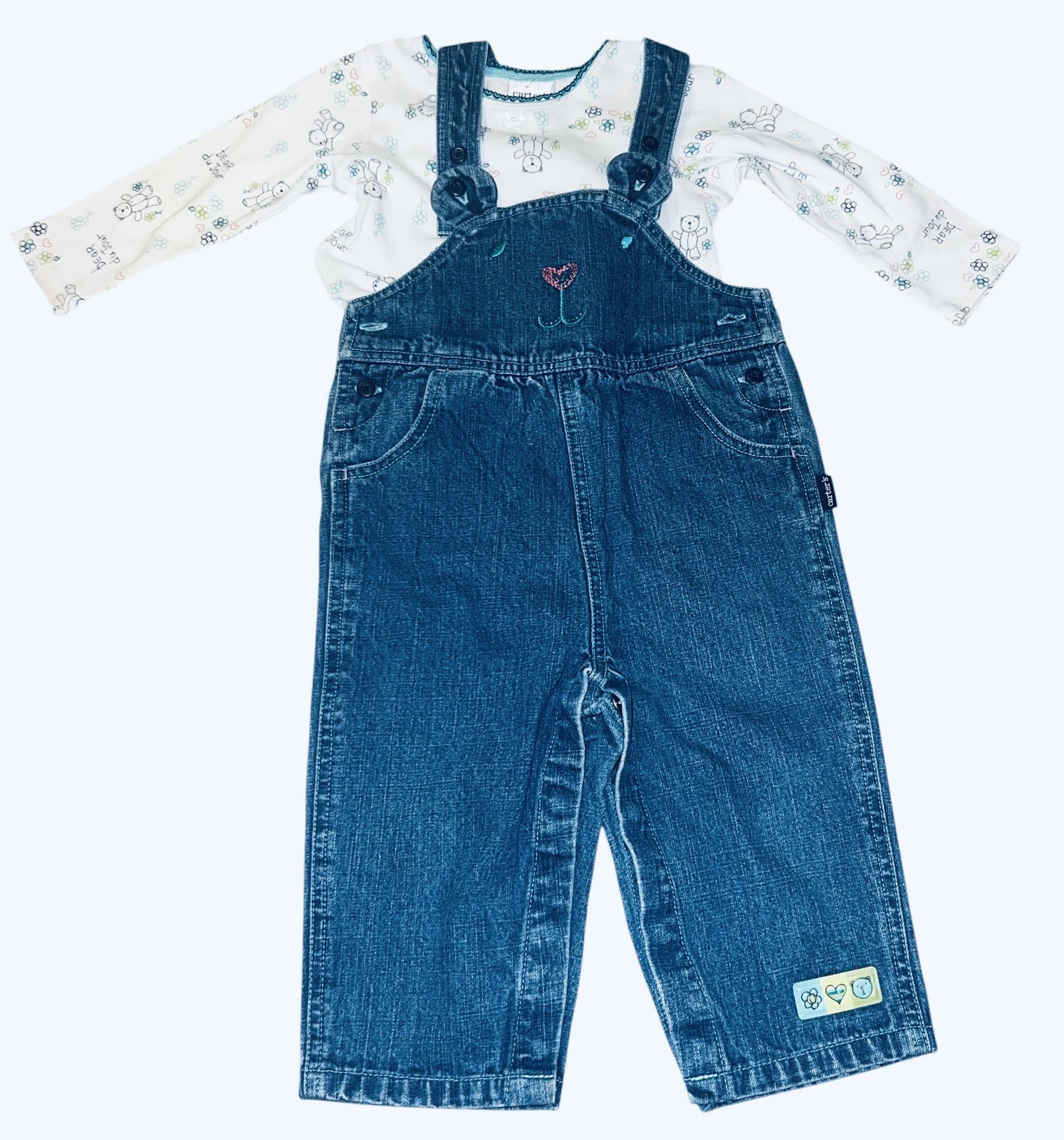 Carter's Girls Vintage Denim Overalls Bear Du Jour Heart Size 12-18M 2 Piece Set in very good condition.