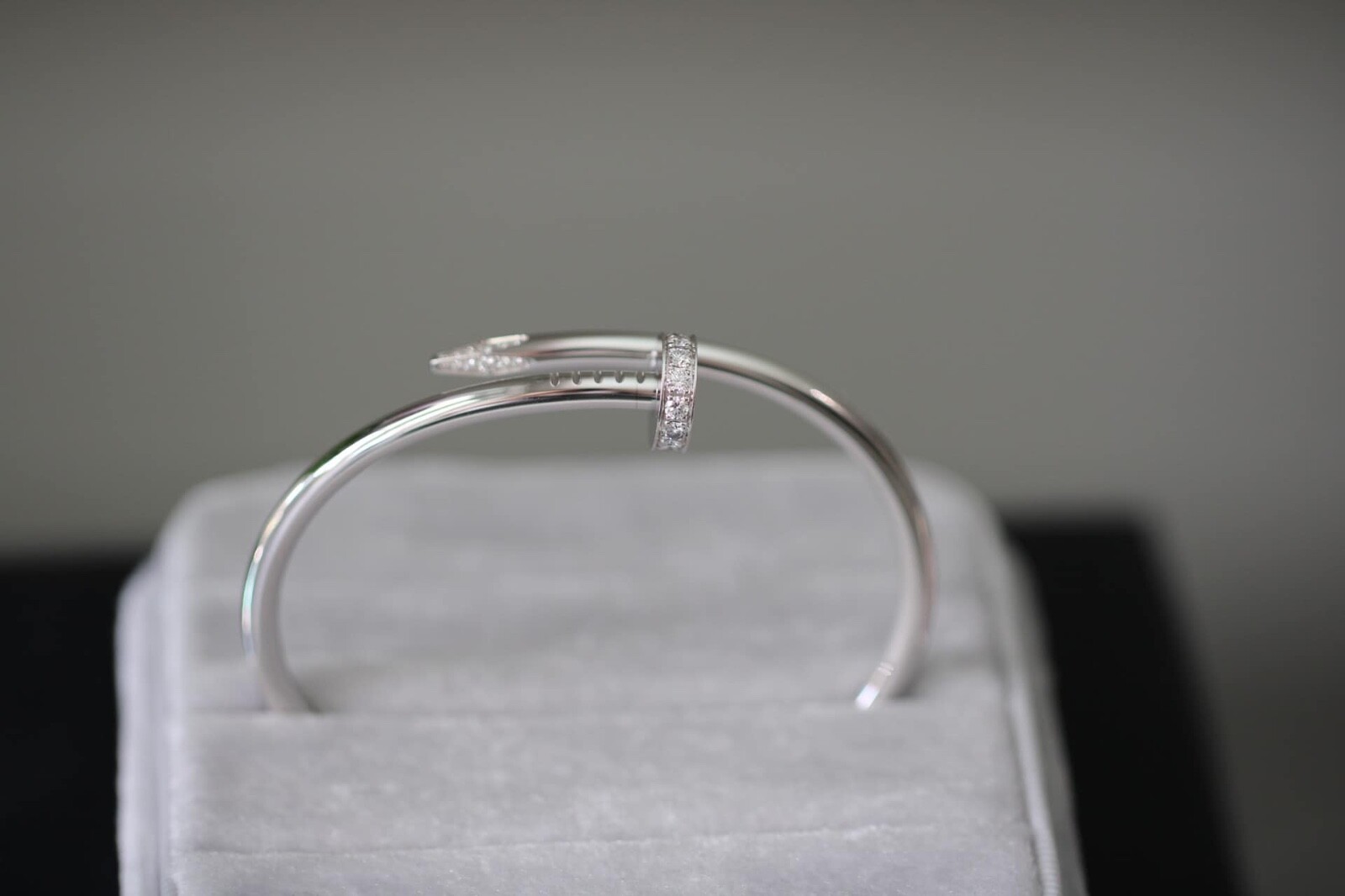 Excellent condition, comes with original Cartier box and can send copy of receipt (purchased at Cartier boutique directly). Juste un Clou bracelet, classic, 18K white gold (750/1000), set with 32 brilliant-cut diamonds Size 17. $14,200 plus tax retail