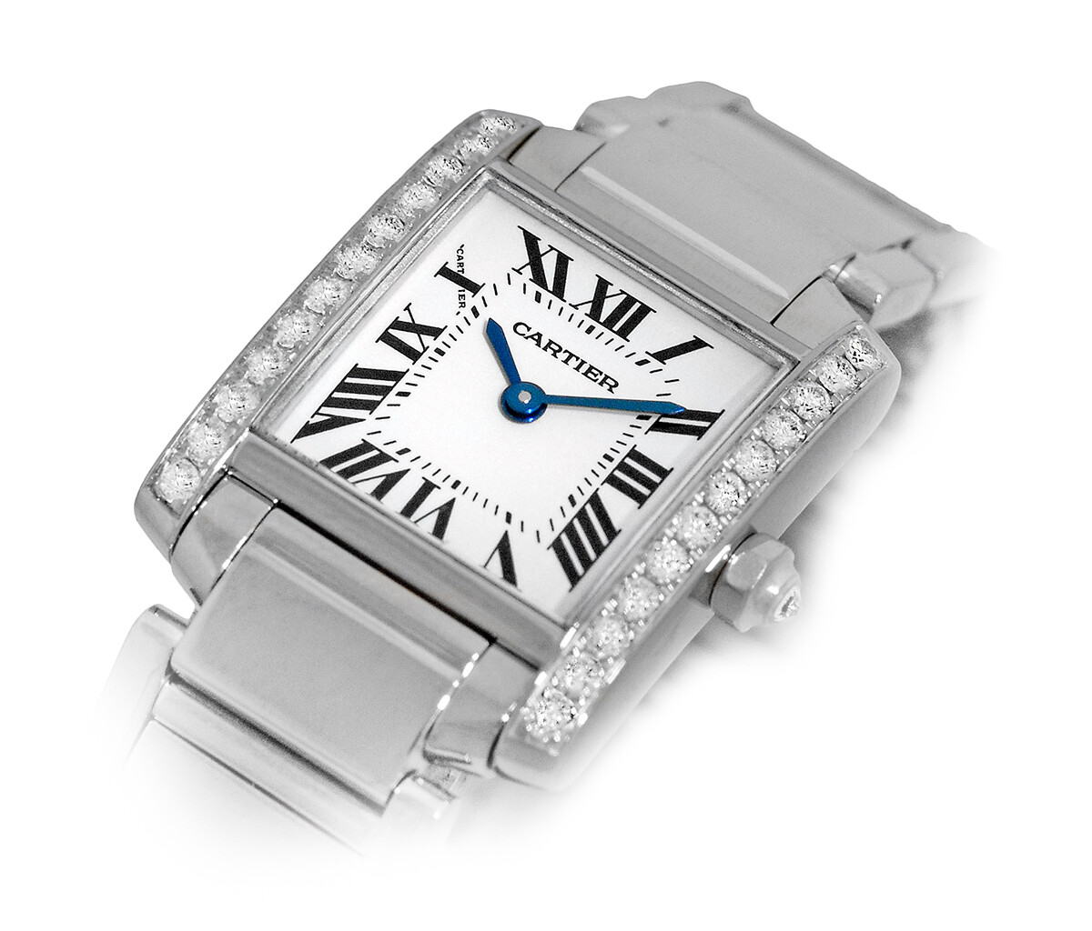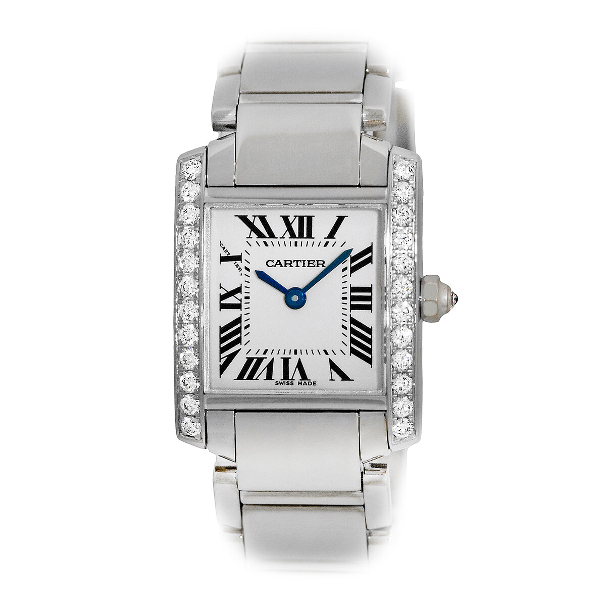 CARTIER 18K White Gold 20mm Tank Française Factory Diamonds WE1002S3 Box Warranty Lady's 18K White Gold 20mm Cartier Diamond "Tank Française" Quartz Item #: CT37132 Brand: Cartier Model: Tank Française Reference No: WE1002S3 Gender: Lady’s Movement: Swiss Quartz Accuracy Movement. Case Measurements: Case Size: 20mm x 20mm ( 25mm with Case Lugs.) Case Thickness: 6mm Water Resistance: 30m / 100ft Dial: Silvered Dial Markers: Printed Black Roman Numerals Bracelet / Strap: 18K White Gold Cartier Tank Française Dual Deployant Clasp Bracelet Features: Sword Shaped Blued Steel Hands and Black Roman Numerals. Cartier Factory Pave Diamond Case & Diamond Setting Crown. Includes: Red Cartier Box and Capetown's Lifetime Watch Warranty Condition: Like New Description: Lady's 18K White Gold Cartier Diamond "Tank Française" Quartz. Ivory/Silver Dial with Sword Shaped Blued Steel Hands and Black Roman Numerals. Cartier Factory Pave Diamond Case & Diamond Setting Crown. Matching 18K White Gold Cartier Tank Française Dual Deployant Clasp Bracelet. Reference No: WE1002S3 Case Size: 20mm x 20mm ( 25mm with Case Lugs.) Case Thickness: 6mm Water resistance: 30m / 100ft Swiss Quartz Accuracy Movement. Like New, PERFECT Condition with Red Cartier Box and complete with Capetown's Lifetime Warranty!! Remember, we are always here if you have any questions or concerns, please just let us know Thank you About Us Capetown Diamond is the originator of the high-end fine Swiss watch & precious jewelry discounters. Our company, founded in 1969, is the World's Foremost Discounter of Fine Swiss Watches, Precious Jewelry, & Certified Diamonds. We have tens of thousands of satisfied clients worldwide. We not only vend through the web, but we own our own building in Roswell, GA, a northern suburb of Atlanta. Our inventory includes literally all famous brand name fine Swiss timepieces. Capetown is also the originator of the Lifetime Fine Watch Service Warranty applicable to both new & certified pre-owned contemporary timepieces. Please call us for a complimentary evaluation. Our vast inventory of certified diamonds, precious & diamond jewelry includes custom designed & brand name designer pieces. Our precious and diamond jewelry is accompanied by an independent laboratory certification from laboratories such as GIA, IGI, Fifth Avenue Labs, EGL, etc. Capetown Guarantee All watches sold by Capetown Diamond Corporation are carefully inspected by our team of in-house watchmakers with decades of experience with even the most complicated timepieces. We stand behind every watch we sell and unconditionally guarantee the authenticity of them. There are no implied factory warranties; however, watches that are new come with box, booklets & warranty papers. All watches are guaranteed authentic, and all our contemporary watches are accompanied by Capetown's Lifetime Service Warranty. All vintage watches carry a 1 year service warranty. Warranty covers any mechanical issues including timekeeping or malfunctions. Warranty does not cover broken crystals, damage caused by water or any damage caused by abuse or neglect. *For information on our Lifetime Warranty, please call for more information. All jewelry items are guaranteed to be as represented; including gemstone authenticity, weights, and precious metal content. All jewelry items over $1,000 are accompanied by an independent laboratory certification from laboratories such as GIA, IGI, Fifth Avenue Labs, EGL, etc. Policies How To Order from Capetown We sell on a first-come, first-serve basis. Some items are one-of-a-kind and as such are subject to prior sale. Please contact us to confirm availability. Buyers with fewer than 5 transactions or accounts newer than 30 days must contact us via email or telephone prior to placing a bid. To Purchase, use "Buy It Now" feature or call or email us to make payment arrangements. Your Item will be shipped after funds clear. We will email you a tracking number. Please call or email us when the item arrives. We leave feedback on all purchases. We would appreciate you to leave feedback as well. Payment Payment is due upon the close of auction and is expected no later than 5 business days from the auction end date. We will report any unpaid auction items to Ebay after 5 business days as well as relist the item without any further notice to the original winning bidder. If you have any questions about payment forms, please contact us. Payment Options Credit Card: We accept credit card payment on purchases of $6,500* or less. (Completion of credit card authorization form required) International Customers: The only form of payment accepted for International Customers is via Secure Banking Methods. Please contact us for our bank details. Sales Tax All items shipped within the state of Georgia are subject to an additional 7.75% sales tax. Shipping & Insurance $50 — 1-2 Days FEDEX (fully insured). Within USA: (Value over $20,000) Please call or email us for the shipping & insurance cost. International: Email us your city & country and we will contact you with the shipping & insurance cost. Returns There are no returns on new watches or special ordered items. Jewelry & pre-owned watches carry a 3 day return privilege as long as the following criteria are met: Upon receipt of the merchandise, you must immediately (that same day) advise us of your intent to return the purchase. Contact must be made by telephone. No email, snail-mail, or faxes All return packages must have Capetown's return authorization number prominently displayed on the box. This number will be provided when you notify us of your intent to return. Packages returned without a Capetown Return Merchandise Authorization Number (RMA#) will not be accepted. The item must be returned, pre-paid and insured at your expense, via UPS Next Day Air Service. Additionally, it must be returned back to our Atlanta Mail-Order Center with 3 days of the shipper's recorded delivery date. (In other words: if 