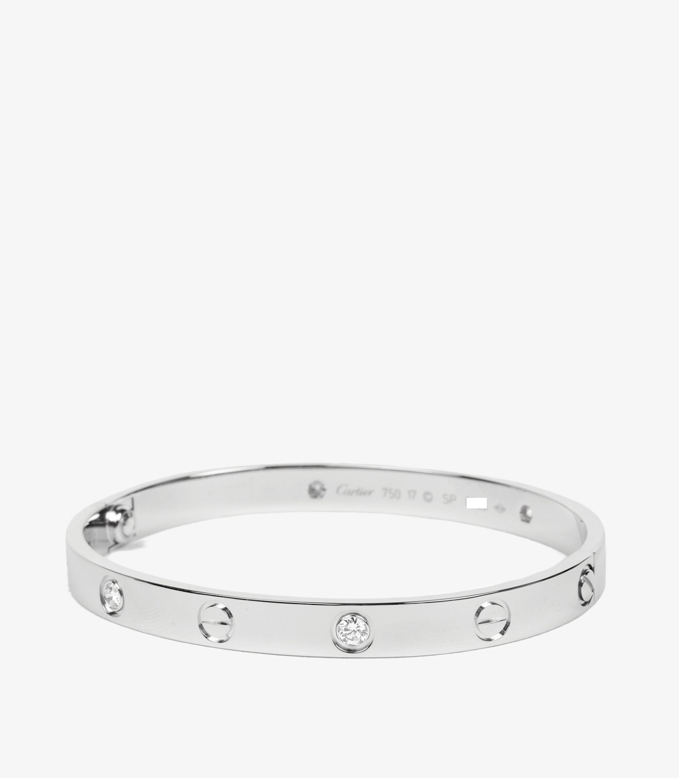 Cartier 4 Diamond 18ct White Gold Love Bangle Product Details Xupes Ref: J1452 Brand: Cartier Model: 4 Diamond Love Bangle Type: Bracelet Serial Number: S***** RRP: £12,200 Accompanied By: Cartier Pouch, Screwdriver, Service Papers Material(s): 18ct White Gold Gemstone: Diamond Specification Gemstone Quantity: 4 Gemstone Cut: Round Brilliant Gemstone Carat Weight: 0.42ct Total Weight: 32.57g Bracelet Length: 17cm Bracelet Width: 6mm Condition Condition Rating: Excellent Condition Notes: An item rated as excellent exhibits minimal to light signs of use. Xupes Promise We understand that purchasing pre-loved fine jewellery online can be daunting. As members of the National Association of Jewellers, our entire business is based on trust and integrity so when shopping with us, you can be assured that every single item in our collection has passed a rigorous quality and authentication process, conducted by our team of in-house experts. Every purchase is backed by our Xupes Promise which includes our industry leading 30-day return policy and a money-back authenticity guarantee so you can shop our hand-picked collection with confidence. Delivery of UK Orders We offer a complimentary fully insured delivery service for all UK orders completed before 12pm, usually via Royal Mail or DHL. If your order is placed after this time, or during the weekend, your item(s) will be dispatched on the nearest working day. Please be aware that your parcel will require a signature upon delivery and tracking information will be supplied on the day of dispatch. Named day delivery options are available upon request. Delivery of International Orders We offer complimentary fully insured delivery on all international orders, usually via Royal Mail or DHL. If your order is completed before 12pm (GMT) your item(s) will be dispatched on the same day. Please be aware that your parcel will require a signature upon delivery and tracking information will be supplied on the day of dispatch. International orders may be liable to customs and excise duties or taxes when purchasing from us. Please be aware any charges will be the buyer's responsibility and handled directly with the chosen courier. Contact from the courier will be made during the shipment process and any charges must be settled for the goods to be released for delivery. Please note that we will not declare items below the sale value or as a gift.