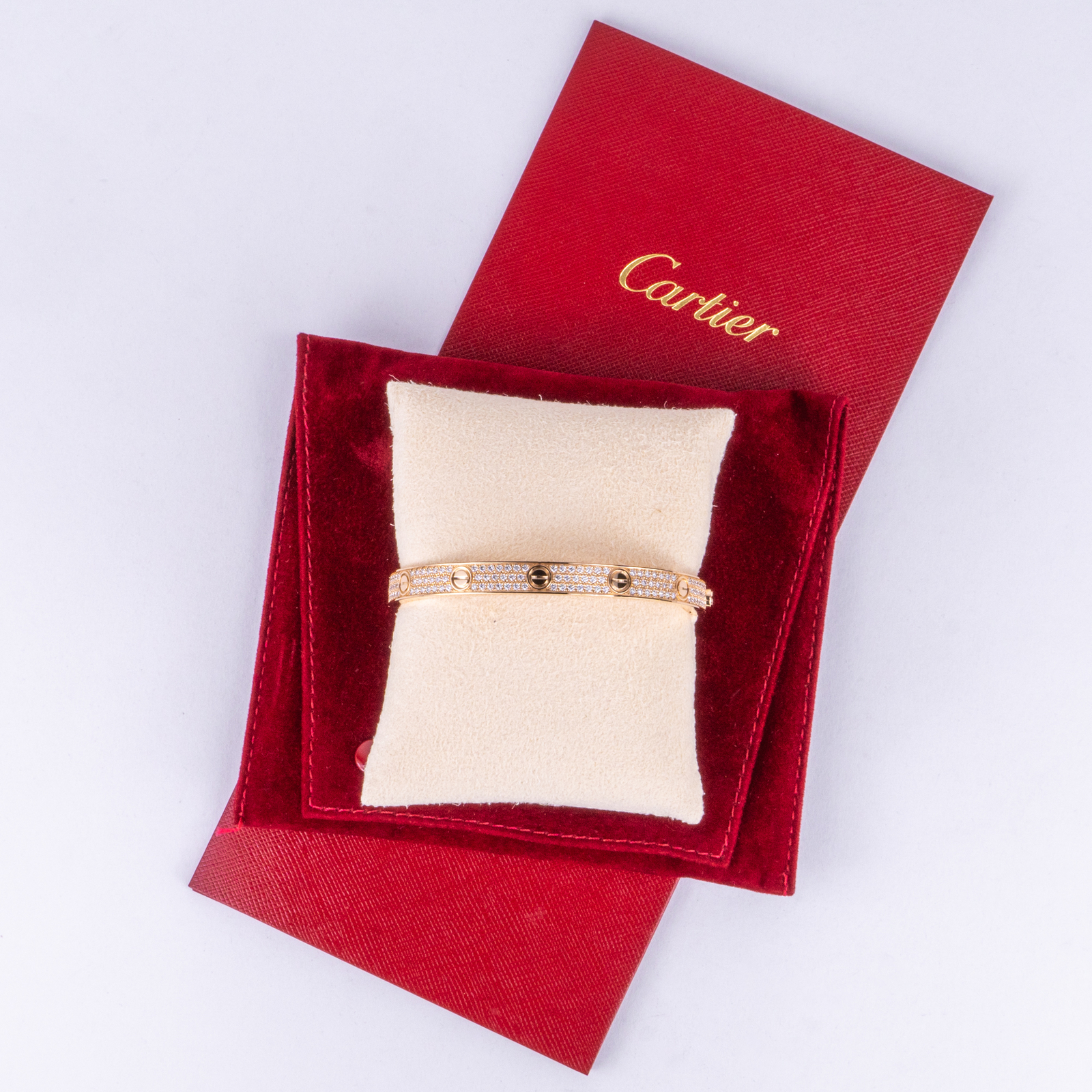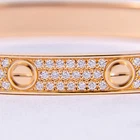 Celebrating 3 4 years in business and 23 years on eBay!! Our Store | Our Feedback | Contact Us Cartier 18k Rose Gold 6.7mm Pave Diamond Love Bracelet Size 19 Brought to you by Pawn and Jewelry is this pre owned Cartier bracelet . This is for of the bracelet, Cartier pouch with cushion, and a reciept from a polish at Cartier. It weighs 52.3grams or 33.6dwt. This listing is for the single bracelet, however, we do have them in all three colors listed on eBay, all of which can be seen together in the last photographs. Brand: Cartier Maker: Cartier Type: bracelet Style: Bangle Metal: Rose Gold Metal Purity: 18k Weight (grams): 52.3grams Weight (dwt): 33.6dwt Size: 19 This piece was professionally polished by Cartier themselves, however, there may be few light scratches and wear. The photographs are of the exact item and are a true representation of the condition. If you would like more information please ask! You can own this item from one of the leaders in the business today for a fraction of the list price! ______________________________________________________ Please read entire auction description before buying. This will make a fine addition to any valuable collection! We have been selling on eBay since 1998 GOOD LUCK AND THANK YOU FOR VIEWING! All Rights Reserved © 2021 Designated trademarks and brands are the property of their respective owners.