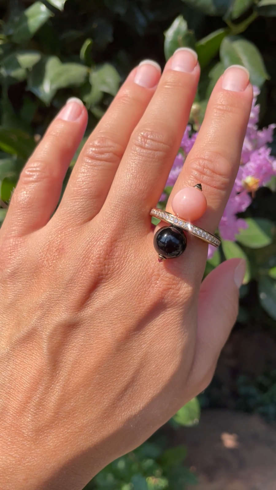 Signed Baubles LLC This wonderful Cartier ring is part of Evasions collection. Masterfully crafted from 18K rose gold the ring is decorated with pink opal that creates a beautiful contrast with black onyx. The ring is accented by pave diamonds totaling 0.66 cts DE color/VVS clarity and pink sapphires. Signed and hallmarked by the house of Cartier. It is size 56 FR, size 7.5 US. Weight - 17.9 gr. The ring is in perfect condition.