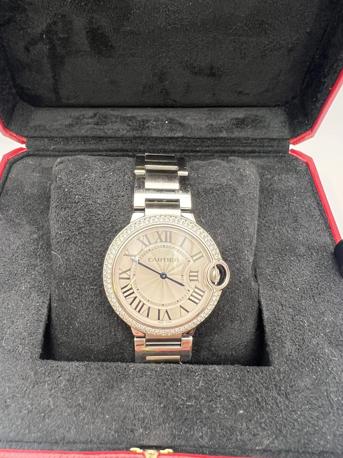 Cartier Ballon Bleu W69011Z4, featuring a 36mm stainless steel case with a custom diamond bezel, adding a luxurious and eye-catching sparkle. The iconic rounded case design is complemented by Cartier’s signature silvered guilloché dial with bold Roman numeral hour markers and blued steel sword-shaped hands. The distinctive fluted crown, set with a blue synthetic cabochon, maintains the classic Ballon Bleu aesthetic. Powered by a precise quartz movement, this watch ensures hassle-free and reliable timekeeping. The timepiece is fitted with a stainless steel bracelet with a hidden deployment clasp for a seamless, refined look.A perfect combination of elegance and customization, this Cartier Ballon Bleu is both stylish and sophisticated. Comes with box and certificate of appraisal. Message or call to inquire. Cartier Ballon Bleu 36mm Custom Diamond Bezel W69011Z4 Quartz Box Set Description Cartier Ballon Bleu W69011Z4, featuring a 36mm stainless steel case with a custom diamond bezel, adding a luxurious and eye-catching sparkle. The iconic rounded case design is complemented by Cartier’s signature silvered guilloché dial with bold Roman numeral hour markers and blued steel sword-shaped hands. The distinctive fluted crown, set with a blue synthetic cabochon, maintains the classic Ballon Bleu aesthetic. Powered by a precise quartz movement, this watch ensures hassle-free and reliable timekeeping. The timepiece is fitted with a stainless steel bracelet with a hidden deployment clasp for a seamless, refined look.A perfect combination of elegance and customization, this Cartier Ballon Bleu is both stylish and sophisticated. Comes with box and certificate of appraisal. Message or call to inquire. Ships from Address 608 5th Ave, STE 406 - New York NY, 10020 Phone 16466697750 Condition Pre Owned Highlights Case Size 36 mm Box Yes Papers No SKU 000833 General Info MSRP 11995 Brand Cartier Type Wristwatch Department Unisex Adult Model Number W69011Z4 Country/Region of Manufacture Switzerland Style Dress/Formal Model Cartier Ballon Bleu Features/Other Details Year Manufactured 2010-2019 Customized Yes Handedness Right With Original Packaging Yes With Papers No SKU 000833 Features Diamond Accent, Fixed Bezel, Push/Pull Crown, Sapphire Crystal, Swiss Made, Swiss Movement, Water-Resistant Band/Bracelet Details Band Color Gray Band Material Stainless Steel Closure Hidden Fold Clasp Band Type Bracelet Band Width 18 mm Lug Width 18 mm Case Details Case Material Stainless Steel Case Color Gray Water Resistance 30 m (3 ATM) Watch Shape Round Caseback Screwback Case Finish Polished Case Size 36 mm Case Thickness 12 mm Bezel Details Bezel Type Diamond, Fixed Bezel Color Gray Display Dial Color Silvered Guilloché Display Analog Indices 12-Hour Dial, Roman Numerals Movement Movement Quartz Shipping Warranty Return Policy FAQ We take all steps to make shipping as seamless and secure for both us as the seller and you as the buyer. We ship all items via Federal Express, all items require signature on delivery to confirm receipt of the package. Furthermore, most higher priced watches sold on eBay go through the authentication program where we ship the watch to eBay and they then send it along to you after passing their authentication and certification process. This ensures that you are receiving exactly what you bought as described for a worry free transaction process. Unless otherwise stated most new items carry the manufacturer warranty from the date of the original sale and they will be the implied warranter of said items. If no warranty is implicitly described we warranty against any defects in mechanical workmanship for up to one year from purchase. Pre-owned watches will list what manufacturer warranty, if any, applies. In some instances items are listed without mention of warranty. Accidental damage, wear and tear, loss or theft, water damage and deviations of timekeeping are not covered. Third-party modification or service and/or improper use, as determined at our discretion, are not covered and may void the overall warranty; in these instances repairs can still be performed at a cost. Warranty covers labor only on the movement; Replacement or repair of parts, if any are required, are subject to a charge. In the rare event some parts that are no longer produced or cannot be obtained and a repair is required, aftermarket parts may be used but are 100% matches to OEM specifications for function. Warranty repairs are subject to shipping charges, local drop off and pickup is also available. Even outside of a warranty period we can always provide top quality service and very competitive pricing with very fast turnaround times for service, repair and/or refinishing/polishing by our expert Watchmakers trained and specialized in Swiss Mechanical Watches. Most items have a worry free 14 day return policy. All items are photographed and described accurately and shipped in the condition described. Any signs of wear may void any return privileges or be subject to a restocking fee of 10-50%, the watch must be returned in the condition received, in working order and free from signs of use and wear. The packaging process is under constant video surveillance and securely sealed in its packaging box. Should you need to return the item please reach out to us first so we may assist you in that process if there is anything that is needed as well as to guide you on the process to ship us back something securely. Q: How may we contact you? A: We are available through ebay messaging, phone, whats app or in office as well as on social media. Chrono On Fifth LLC 608 5th Ave STE 406 New York, NY 10020 tel or what app 646 669 7750 IG: @ChronoOnFifth Q: Are all of the items listed original and authentic? A: Yes! All of our items are guaranteed authentic. Very few items may be customized (Bezels, Dials, Custom set diamonds etc) and they are clearly and accurately described as such. We only source from reputable sources in the indus