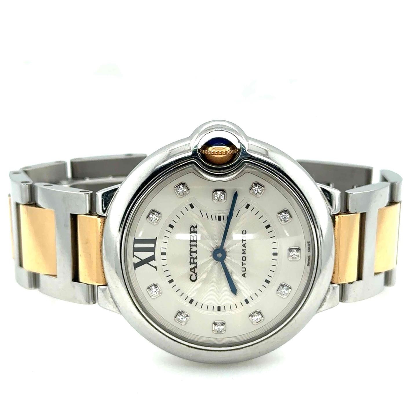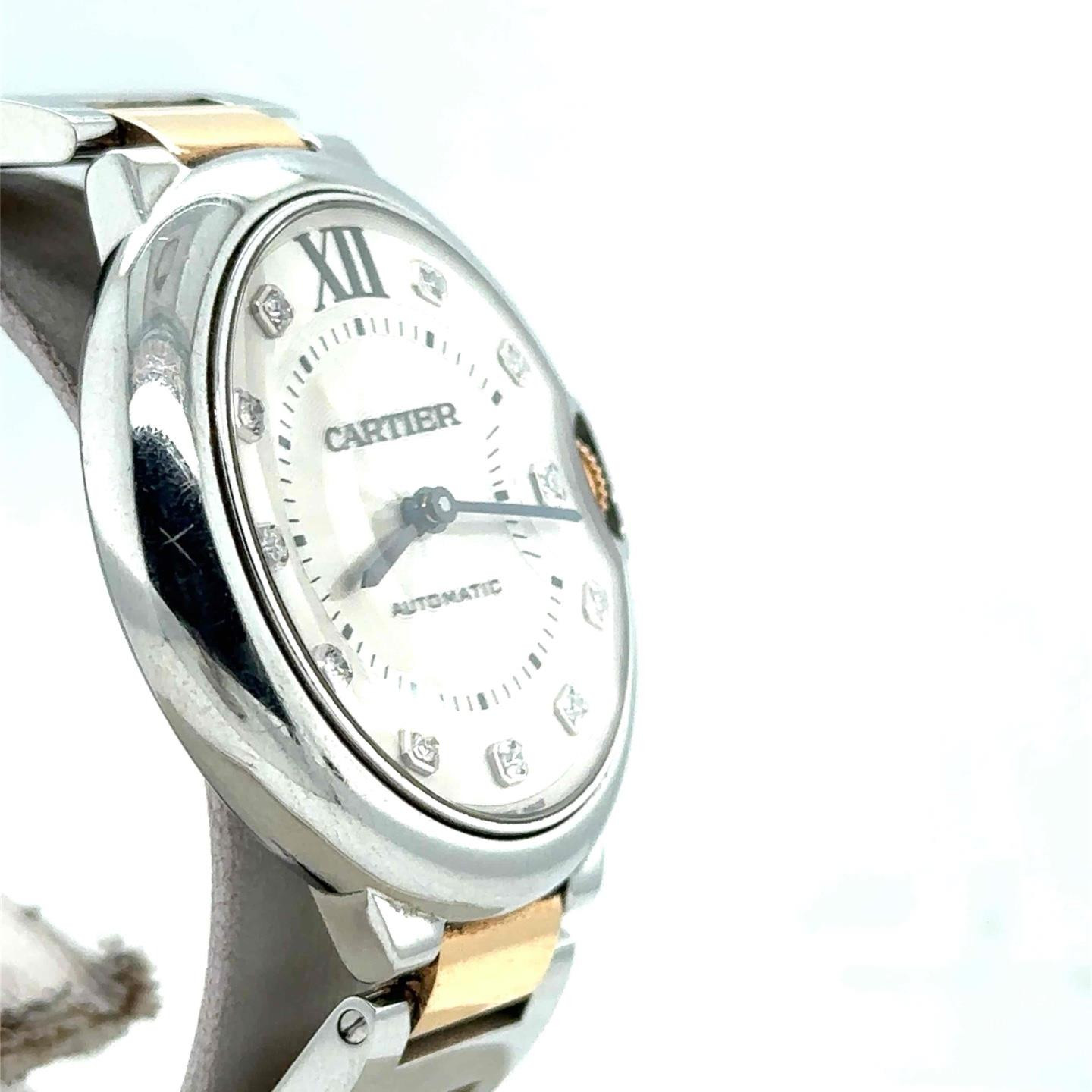 Cartier Ballon Bleu Automatic 36mm 18k Rose Gold & Steel Ladies Watch WE902031 Cartier Ballon Bleu Automatic 36mm 18k Rose Gold & Steel Ladies Watch WE902031 Description Stainelss steel case with a stainelss steel with 18kt rose gold bracelet. Fixed stainless steel bezel. Silver sunray dial with blued-steel sword-shaped hands and diamond hour markers. Black roman numeral marks the 12 o'clock position. minute markers around an inner ring. Dial Type: Analog. Cartier Calibre 076 Automatic movement, based upon ETA 2670, containing 25 Jewels, bitting at 28800 vph, and has a power reserve of approximately 38 hours. Scratch resistant sapphire crystal. 18kt pink gold set with a blue synthetic cabochon crown. Solid case back. Round case shape, case size: 36.6 mm, case thickness: 12 mm. Band width: 20 mm, band length: 8 inches. Hidden deployment clasp. Water resistant at 30 meters / 100 feet. Functions: hour, minute. Ballon Bleu De Cartier Series. Dress watch style. Watch label: Swiss Made. Cartier Ballon Bleu Silver Dial Steel and 18kt Rose Gold Unisex Watch WE902031. General Color Black / Blue / Gold / Rose / Silver Case Case Size 36.6 Case Thickness 12 mm Case Material Stainelss Steel Case Shape Round Case Back Solid Band Band Material Stainelss Steel with 18kt Rose Gold Band Type Bracelet Band Length 8 inches Band Width 20 mm Clasp Hidden Deployment Dial Dial Color Silver Sunray Type Analog Crystal Scratch Resistant Sapphire Hands Blued-steel Sword-shaped Dial Markers Diamond Second Markers Black Roman numeral marks the 12 o'clock position. Minute markers around an inner ring Bezel Fixed Bezel Material Stainless Steel Crown 18kt Pink Gold set with a Blue Synthetic Cabochon Information Brand Cartier Collection Name Ballon Bleu de Cartier Gender Womens Model WE902031 Watch Label Swiss Made Movement Automatic Engine Cartier Calibre 076 Power Reserve 38 hours Features Water Resistance 30 meters / 100 feet Functions Hour, Minute Watch Features Diamond, Stainless Steel, Gold, Analog B565612 EPWWYESX $11,200.00 Showcase your items with Auctiva's Listing Templates! THE simple solution for eBay sellers. Track Page Views With Auctiva's Counter