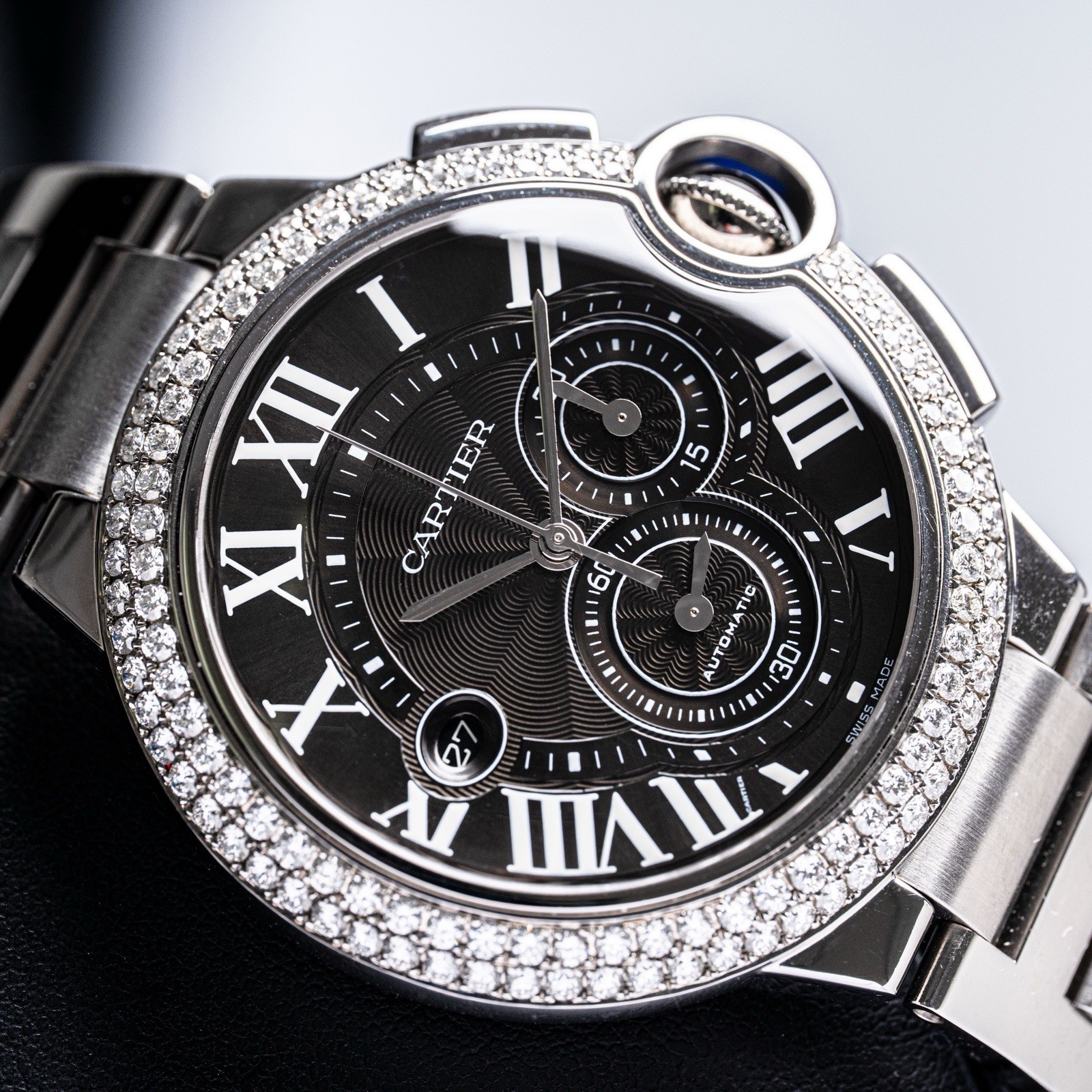 Watch: Cartier Reference: 3109 Comes With: Box Condition / Specifics: This Cartier Ballon Bleu Chronograph is in preowned clean condition with minimal scratching and crystal is clean. The case size is 42.5mm and it has added on diamonds to the bezel that aren’t factory/original to the watch. As always please reach out with any questions prior to purchasing! Additional Notes: • Pictures Accurately Display Condition, So Please View All Photos • Watch Currently Runs (Service History Unknown) • FREE 2 Day Insured FedEx Shipping • NO RETURNS, All Sales Are Final!