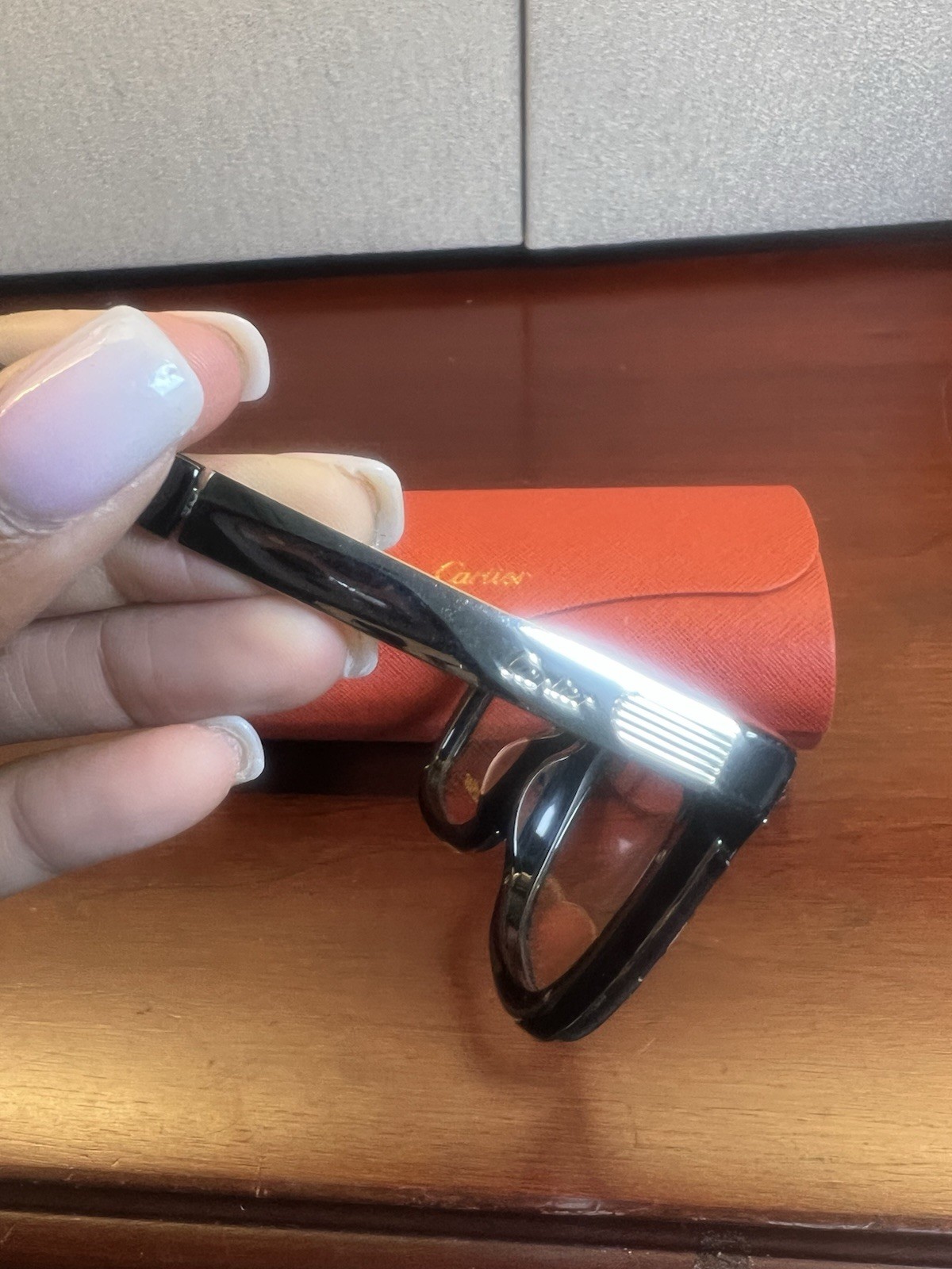 The Cartier Black Eyeglasses Optical Frame, made in France, exude designer style with a solid black metal construction. This full rim frame is suitable for both men and women, featuring a timeless and elegant design that is both functional and fashionable. Made by the prestigious brand Cartier, these eyeglasses showcase quality craftsmanship and sophistication, making them a stylish accessory for any individual looking for a refined and luxurious optical frame option.