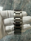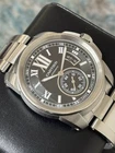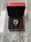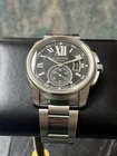 The Cartier Calibre de Cartier W7100016 is a stylish and sophisticated men's wristwatch featuring a sleek silver stainless steel case with a smooth fixed bezel. The watch boasts a classic round shape with a black dial featuring Roman numerals and baton indexes. It is water-resistant up to 30 meters and equipped with a self-winding mechanical movement, making it both practical and luxurious. The bracelet band and case back are also made of stainless steel, ensuring durability and a seamless design. With its elegant features and Swiss craftsmanship, this Cartier timepiece is a timeless addition to any collection.