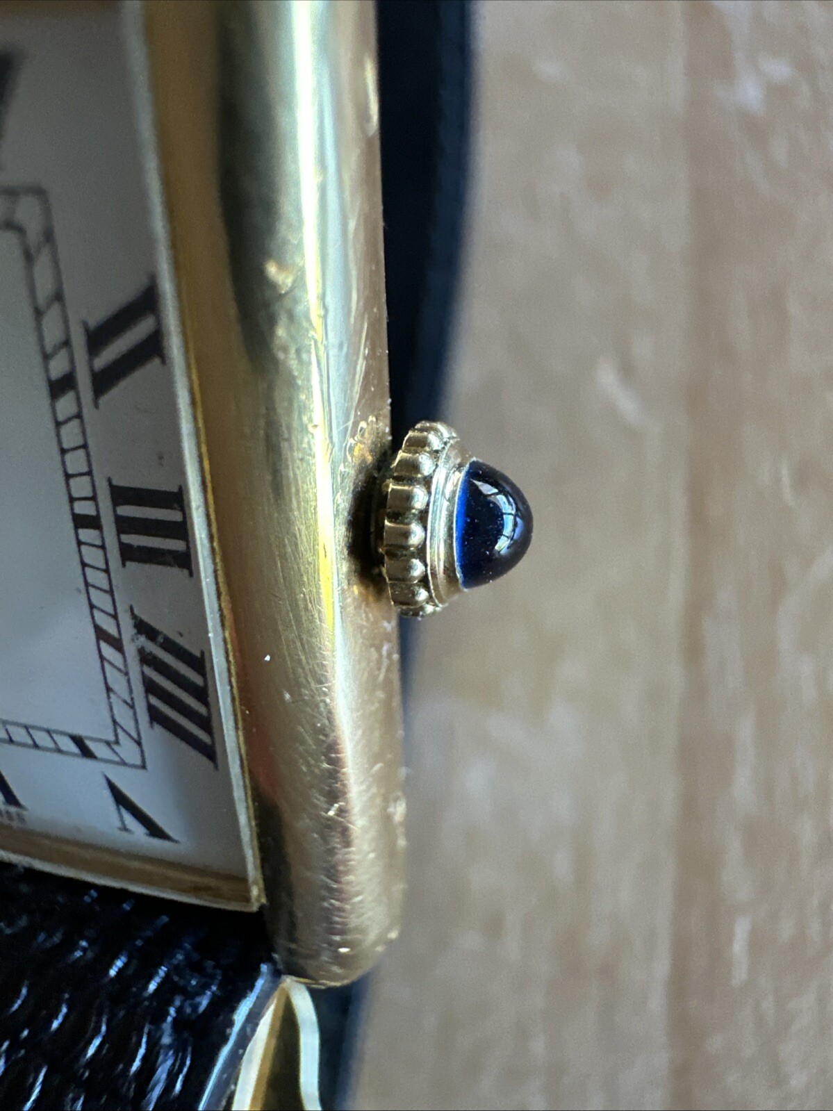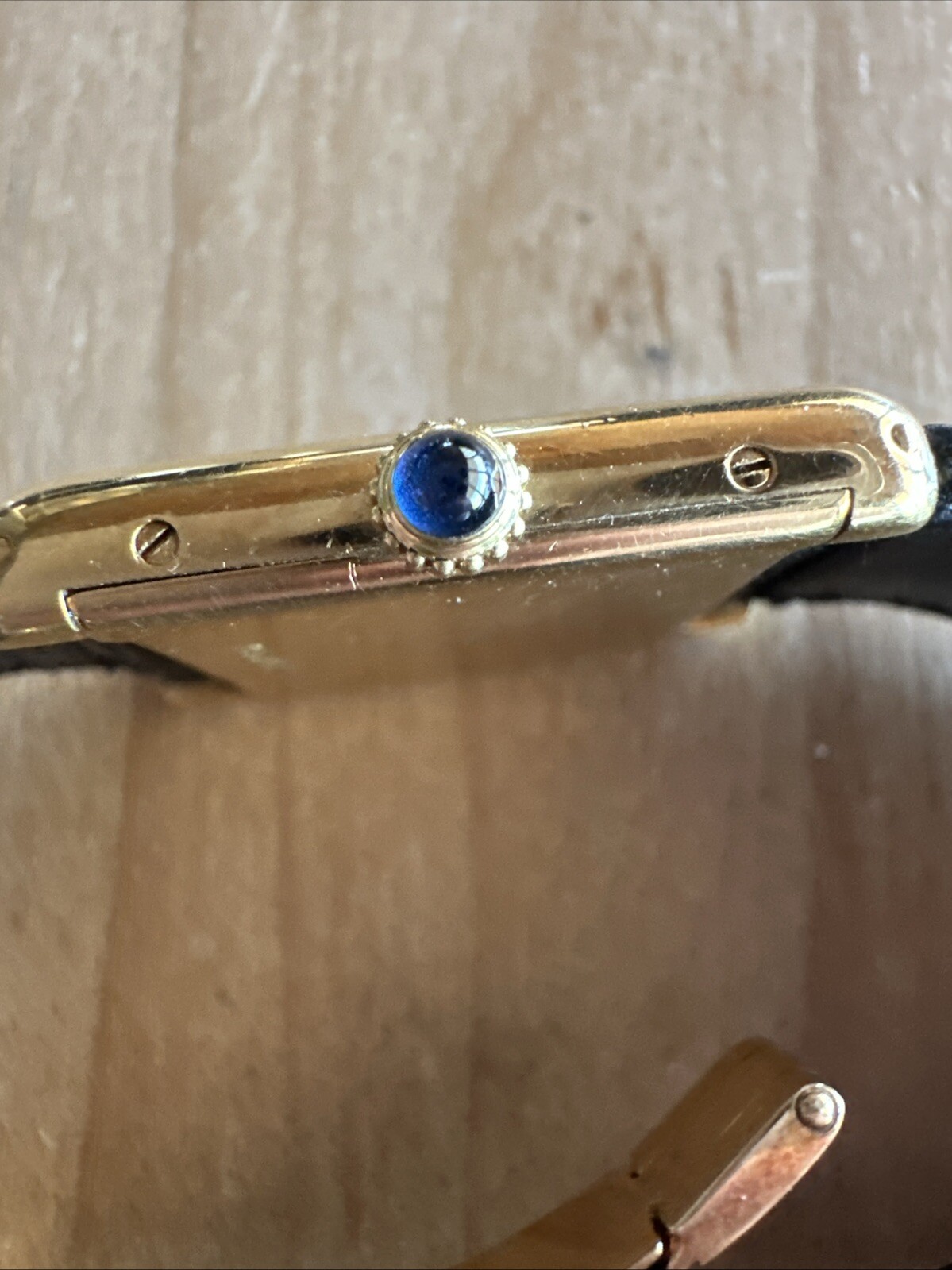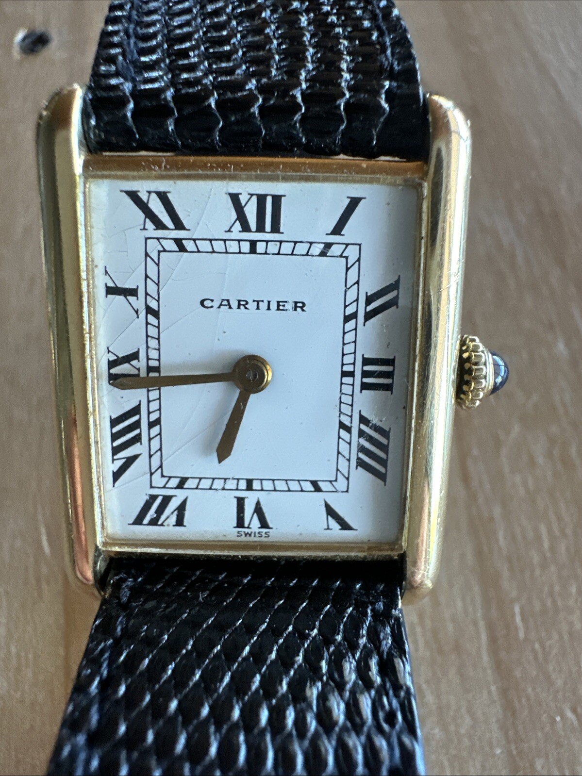 Cartier Louis Tank | 18K Gold | Manual Wind | Vintage 1970s | Signed Deployant Buckle This listing is for a vintage Cartier Louis Tank in solid 18K yellow gold , featuring a manual wind movement , original lacquer dial , and a Cartier-signed 18K deployant buckle . The watch was sold to my father , most likely at Cartier New York , sometime in the late 1970s or early 1980s . It has remained in the family since. This is not a reissue, not a redial, and not an over-polished example. It’s an honest, unrestored Cartier from a golden era — offered here exactly as it was worn: with character, originality, and quiet elegance. 🕰️ For Collectors: Case : Solid 18K yellow gold , hallmarked, unpolished, with original shape and edges intact. Dial : Original white lacquer with visible cracking , common in Tanks from this era. Never redone or refinished. Movement : Manual wind, winds smoothly and runs , but has not been serviced under my ownership. Crystal : Acrylic, lightly scratched but original. Buckle : Cartier-signed 18K gold deployant clasp on a black textured leather strap. If you’re seeking a factory-clean, showroom-style piece — this isn’t that. If you value provenance, untouched surfaces, and the tactile presence of a real vintage Cartier — read on. 📐 Specifications: Model : Louis Tank (manual wind) Material : Solid 18K Yellow Gold Case Size : Approx. 23mm wide x 30mm tall (excluding crown) Lug Width : Approx. 16mm Movement : Manual-wind mechanical (not quartz) Dial : White with black Roman numerals, Cartier-signed Crystal : Acrylic, lightly worn Crown : Blue sapphire cabochon Strap : Leather with Cartier-signed gold deployant buckle Serial Number : 780860073 Era : Circa 1978–1982 Original Purchase : To my father, almost certainly at Cartier New York 🎯 For Designers, Stylists & Cultural Buyers: The Cartier Tank is more than a timepiece — it’s a design icon . Worn by Andy Warhol, Jackie Kennedy, Muhammad Ali, and countless others, the Tank bridges the world of art, fashion, and understatement. Its small scale and geometry make it a perfect unisex dress watch . Wear it with a blazer or with a T-shirt — it looks intentional either way. This is a watch for someone who doesn’t need to explain their taste. Whether you’re a seasoned collector or a first-time Cartier buyer, this piece offers both pedigree and presence . 📦 Shipping & Terms: Ships fully insured via FedEx or UPS International buyers welcome Sold as-is with no returns — please ask any questions in advance 🔚 Final Thought: This vintage Cartier Louis Tank has been in one family for over 40 years. It’s not “mint.” It’s not flashy. It’s just real — and real things hold their value.