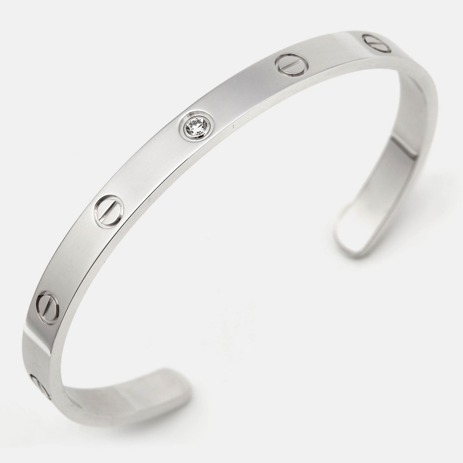A minimalist expression of love, this Cartier cuff is rendered in 18k white gold with a single brilliant diamond. Engraved with the iconic screw motif, it’s sleek, symbolic, and timelessly chic. Stack it with other wristwear or let it shine solo—it’s a modern heirloom.Certified by The Luxury Closet - This item has gone through a detailed authentication process overseen by our experts. We offer a lifetime guarantee of authenticity on all our items. Import duties, taxes and charges are not included in the item price. These charges are the buyers responsibility. Please check with your country’s customs office to determine what these additional cost will be prior to buying. Our eBay Store About Us Contact Us Add to Favorite Sellers Cartier Love White 1 Diamond 18k White Gold Open Cuff Bracelet 19 $5091.9 A minimalist expression of love, this Cartier cuff is rendered in 18k white gold with a single brilliant diamond. Engraved with the iconic screw motif, it’s sleek, symbolic, and timelessly chic. Stack it with other wristwear or let it shine solo—it’s a modern heirloom. Product Details Brand Color White Dimensions Material 18k White Gold Size Outsole Width Outsole Length Heel Height Includes Certified by The Luxury Closet This item has gone through a detailed authentication process overseen by our experts. We offer a lifetime guarantee of authenticity on all our items. How We Check The in-house team of experts at The Luxury Closet is highly trained to verify the authenticity and the condition of the luxury products. They ensure that only 100% authentic items are put on sale.The evaluation process is unique with its own mix of assessment criteria and differs according to the category. Each item is evaluated based on the following combination of hallmarks, hardware, stitching, symmetry, material, craftsmanship, stamping, codes, hologram stickers, and packaging. Our authenticators also check if the items have been modified or amended (e.g., aftermarket diamonds, replaced batteries, repaired bags, etc.) International Buyers Import duties, taxes and charges are not included in the item price. These charges are the buyers responsibility. Please check with your country’s customs office to determine what these additional cost will be prior to buying.