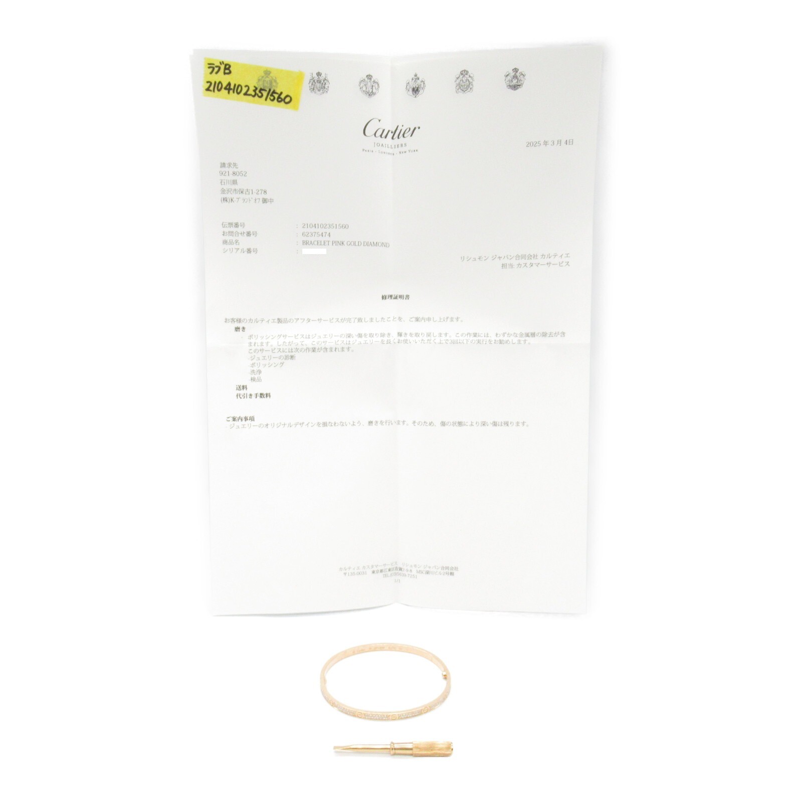 CARTIER Love Bracelet Pavé Diamond SM N6710717 18KPG Pink Rose Gold Used Women Description / Specification Brand Name CARTIER Item Name CARTIER Love Bracelet Pavé Diamond SM N6710717 18KPG Pink Rose Gold Used Women Color Clear‐ish colors Material K18PG(Rose Gold) × diamond diamond Metal Purity K18PG(Rose Gold) × diamond Size Band Length:17cm(6.7") Width:3.6mm(0.1") Weight 18.3g Accessories Repair certificate Accessories not stated are not included. (If there is no mention of a box or dust bag, they are not included either.) Wrist Size(Approx) 〜17cm(-6.7") Instore Code 2104102351560 Up Date 2025/03/06 Condition Pre-owned used Bracelet by CARTIER in good condition . Outside Condition There is some usability, scratches, rubbing, and stain. There are some signs of wear. *This product has been polished, but there may be small scratches that cannot be removed. Thank you for your understanding. Remarks #18 It comes with a screwdriver. Please take a look at the descriptions and the pictures above to check the condition of the item before the purchase. Rank Pristine New, Not used. Excellent Excellent, Allmost as good as new. Very Good A slightly used. Good There are a few scratches, stains and looks a little used. Fair + There are some noticeable scratches and stains. Looks used. Fair There are some noticeable scratches and stains. Looks obviously used. Poor + There are many scratches and stains. Looks very used. Poor Looks very used, but still usable. About Authenticity We have a large selection of luxury brand products We guarantee that all of the items we list and sell are authentic. Feel free to contact us if you have any inquiries or concerns. We are approved seller from Tokyo Metropolitan Police License No : 301061906960(Used Item Seller ) In addition, We also are a member of the Association Against Counterfeit Product Distribution (AACD), and we promise to have no bogus under any circumstances. Please read before order Shipment cannot be marked as a 'gift' or with altered price due to the custom declaration laws. Import duties, taxes, or other additional fees will be charged by your local customs. We are not responsible for any customs and taxes applied to your order. All fees imposed during or after shipping are the responsibilities of the customer (tariffs, taxes, etc.). Please inquire the details of import duties or taxes at the customs office in your country directly before making an order. Payment & Shipping Payment We only accept payments via Managed Payments. Shipping All items will be shipped from Japan. We can only make shipment to the registered address with your ebay account. All orders are processed within 3-5 business days. Orders are not shipped on weekends or holidays. 1.Shipments will be made by DHL. 2.For orders which are not able to be shipped by DHL, they will be shipped by Fedex or UPS. 3.Orders for China will be shipped via EMS of the Japan Post. 4.We currently suspend shipping services to APO/FPO, Brazil, Chile, Indonesia, Mexico, Peru, Philippines, Russian Federation, and Ukraine. Delivery time 1.Delivery usually takes approximately 3-10 business days 2. Shipments might be delayed due to the following reasons: a)Bad weathers b)Public holidays c)Delay at the customs office Returns/Cancellation Policies As we selling our items on other websites and in our retail stores in Japan at the same time, if the item was sold out before your purchase, your order will be cancelled with a full refund Customers are allowed to return the item within 30 days from the delivery or pick up date for a full refund. Items without the security tag are not allowed to be returned. All fees imposed during the return shipping are the responsibilities of the customer Please contact us before starting a return Please provide us the tracking number once return shipment is made. If the mistake caused by human error is occer, please forgive me for cancelling by us. See more Policies & Description