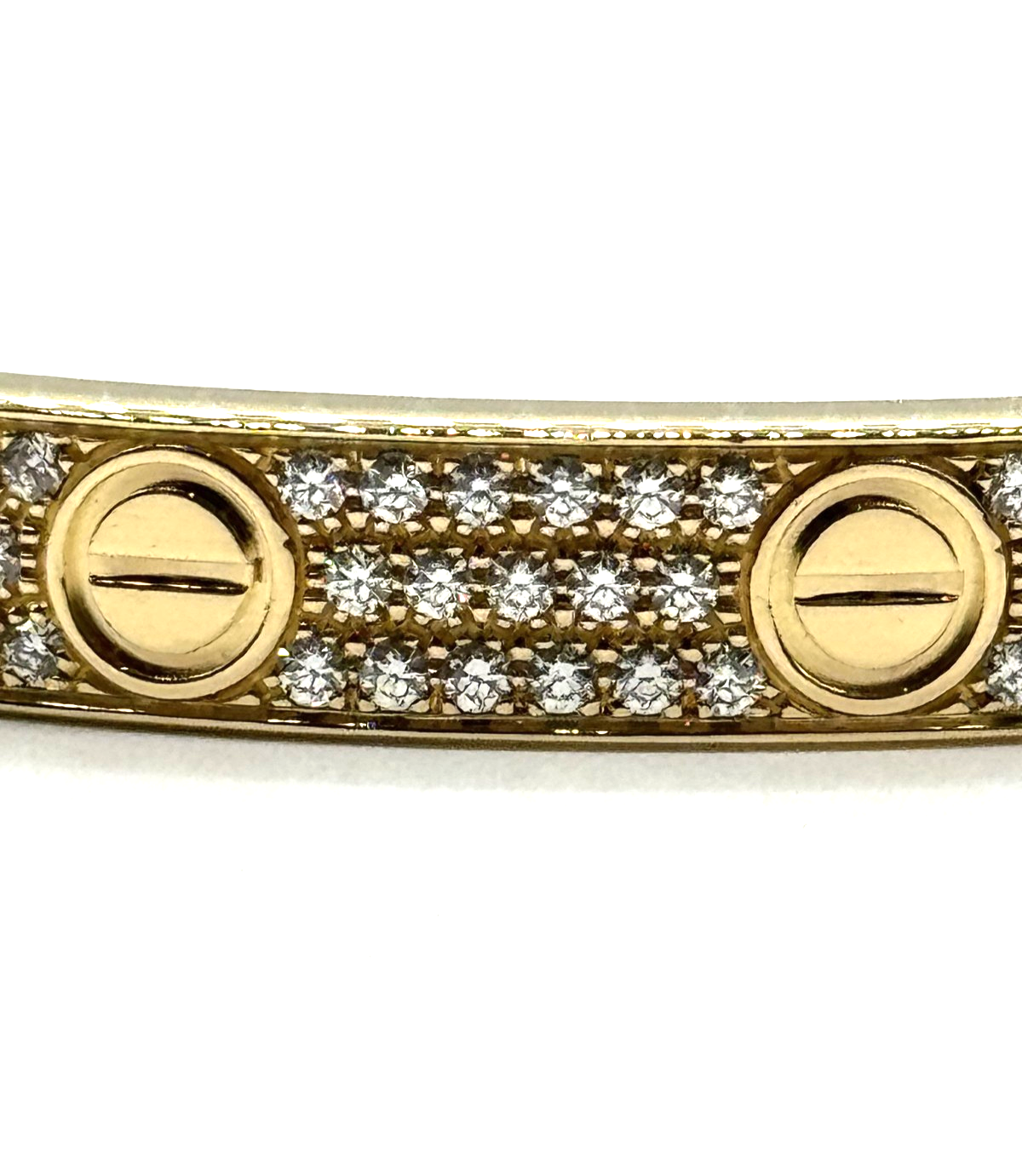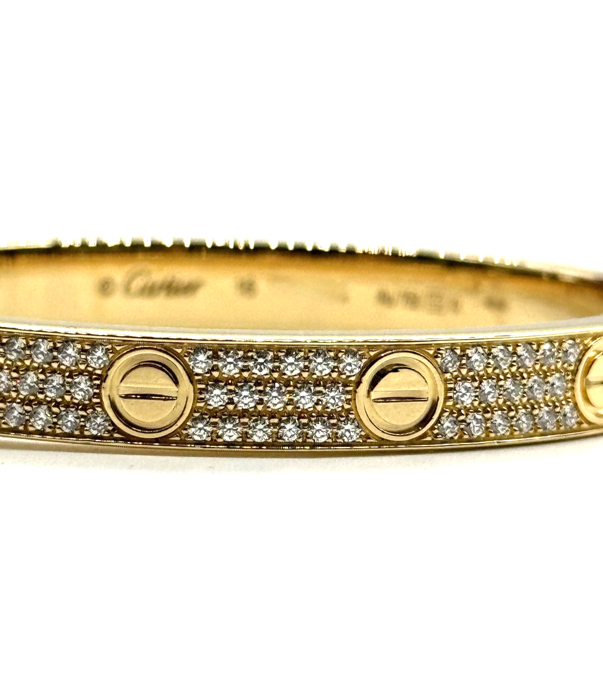 The Cartier 18k Yellow Gold 6mm Pave Diamond Love Bracelet in size 16 is a stunning piece of fine jewelry. It features round white diamonds set in 18k yellow gold with a pavé setting style. The bracelet has a total carat weight of 3.15 and is part of the Cartier Love collection, making it a timeless and elegant accessory for any jewelry lover. Its design exudes love and passion, making it a perfect gift for a special someone or a luxurious addition to any jewelry collection. Dimensions: Diameter : 16 cm Width: 6.1 mm Thickness: 2.0 mm Weight: 41 Grams Total Ct Weight: 3.15 Metal Description: 18 kt Yellow Gold Retail price: $44,800.00 plus taxes Covered under ebay authenticity. Bid with confidence WE ARE NOT AFFILIATED WITH CARTIER This item is in b condition (see table below). We do offer local pickup from our shop. For sales made within California, we charge sales tax of 9.25%. Let us know if you have any questions. We would like to make your transactions with us as smooth as possible. Please read the item descriptions carefully and look at all the pictures closely to make sure the item is exactly what you want. If there are any discrepancies or confusion, send us a message before buying. Let us know if you have any questions or concerns about our items before purchasing.There will be no returns on this item! Grade Descriptions About Condition Of Item A Mint State - brand new WITH OR WITHOUT BOX and in MINT condition. B Used (Great) - Used item in great condition overall, works as intended C Used (Good) - Used item with minor wear, but in good condition overall, works as intended D Used (Fair) - Used item with signs of wear, but in fair condition overall, works as intended E Used (Flawed) - Used item with major signs of wear, and/or missing components, but still works F Used (Damaged) - Used item that is broken and not in working order. Could be used for parts Thank you for your patronage, and happy shopping!