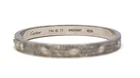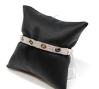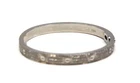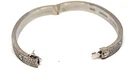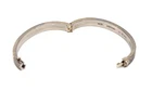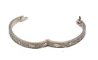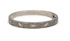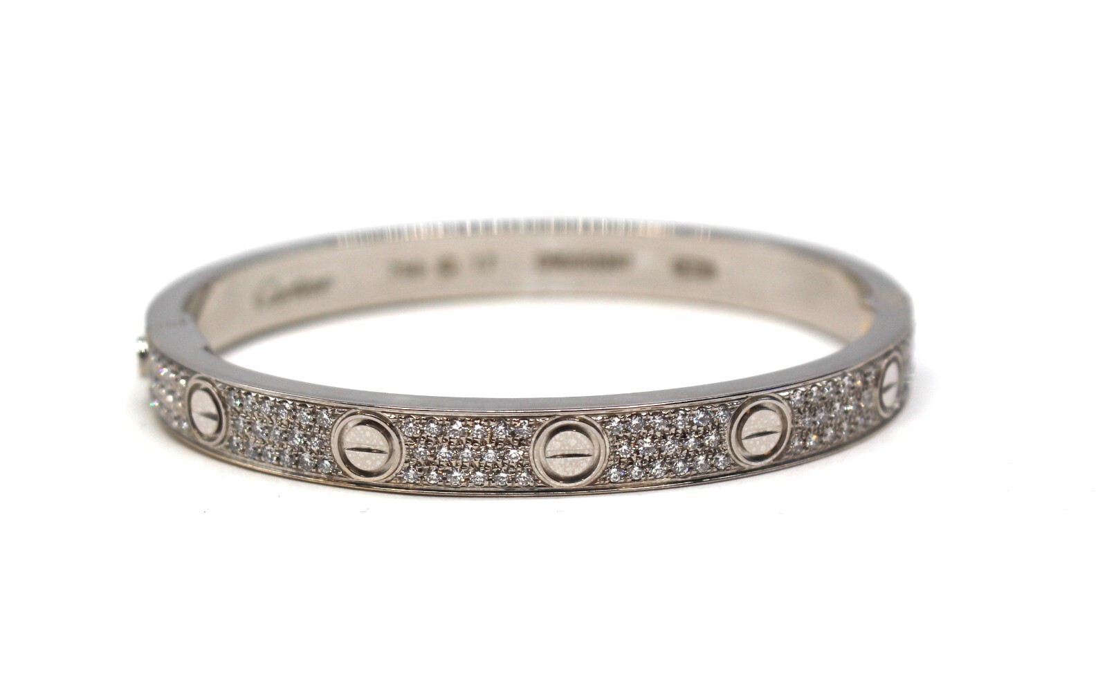 Solid condition. The bracelet is free of any major damage or scratches. The only thing is that you can tell the white rhodium coating is starting to wear off in some parts. The hinge opens nice and freely and is not loose. There is a Cartier box included but it is not Authentic and is not the original box that came with this.