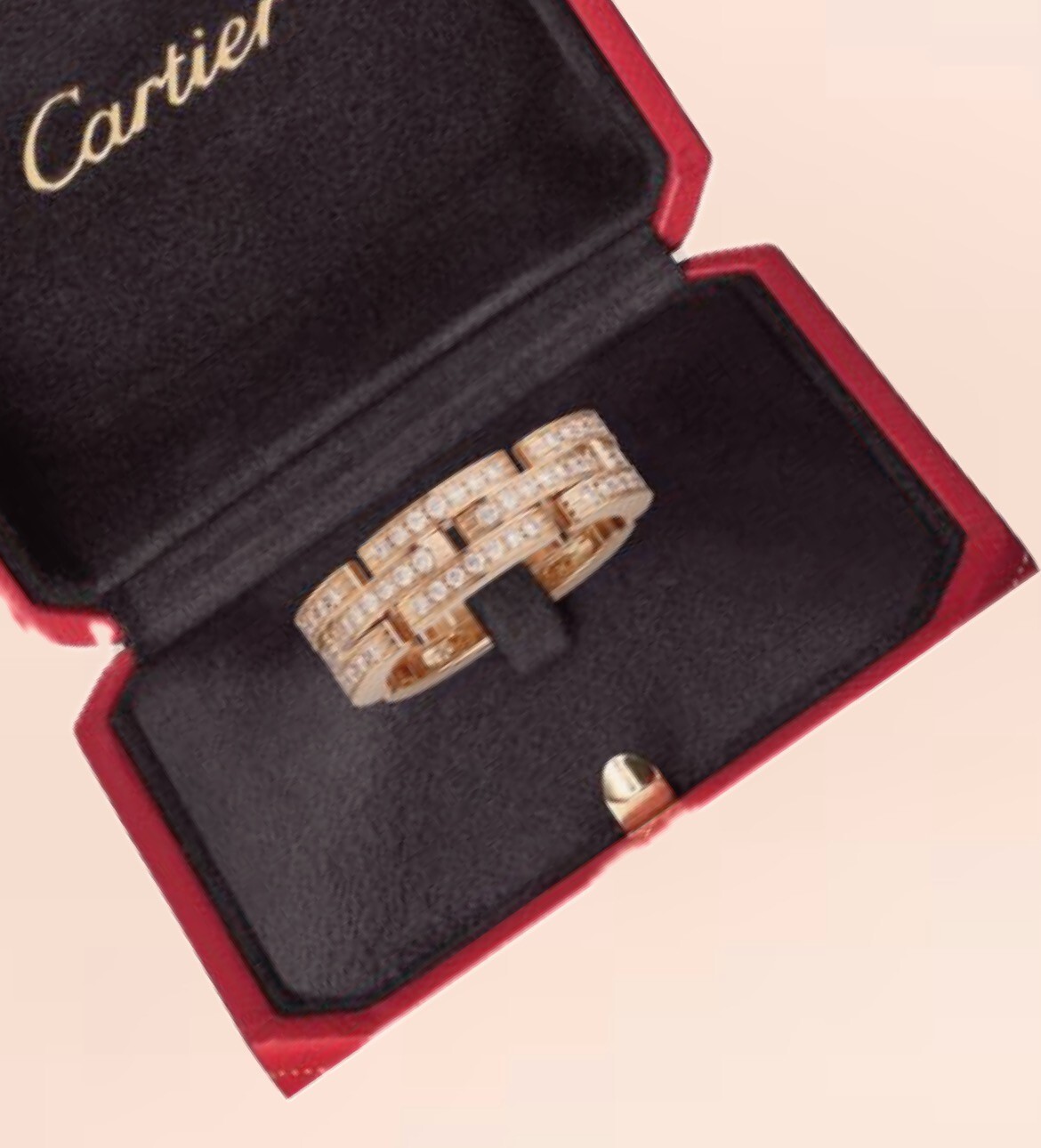 Elevate any look with this stunning Cartier Maillon Panthere Ring in Rose Gold. With 35 round diamonds, this ring is the perfect addition to any occasion, whether it's a wedding, anniversary, or birthday celebration. The rose gold metal and excellent cut grade of the diamonds create a timeless and elegant piece that will be treasured for years to come. The Cartier Maillon Panthere Ring has a total carat weight of .53 CTW and is crafted from 18k gold. The diamonds are natural and not enhanced, with a clarity grade of Very, Very Slightly Included (VVS1) and color grade of DEF. The ring is available in size 6 and features a pavé setting style. This beautiful and luxurious ring comes with its original box and is a must-have for any jewelry collection.