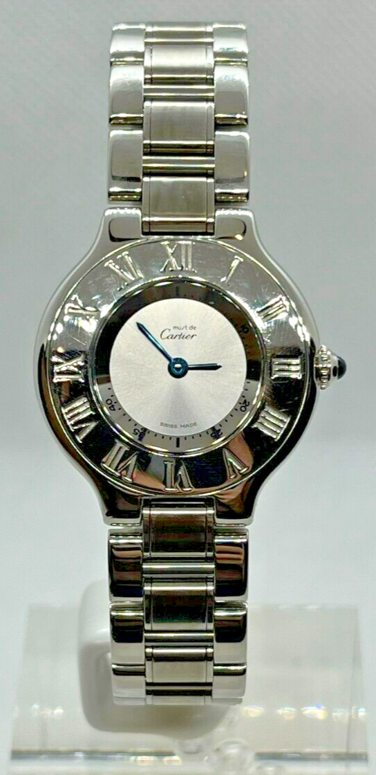 This Cartier Must de Cartier 21 luxury wristwatch is a stunning timepiece that is sure to impress any watch collector or enthusiast. The watch features a silver stainless steel case and band, with a white analog display and a screwback caseback. It is powered by a quartz movement and has a reference number of 1340. The watch is suitable for both men and women, and its round shape and luxurious style make it a perfect addition to any dress or formal outfit. With its bezel color of silver and department of unisex adults, this Cartier watch is a must-have for anyone who wants to add a touch of elegance to their wardrobe.