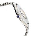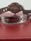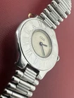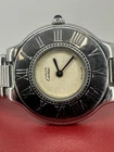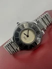 Cartier Must de Cartier 21 wristwatch for women, crafted in Switzerland in the 1990s. The round stainless steel case measures 31mm and features a beige dial. It has a stainless steel bullet bracelet strap and runs on a quartz (battery) movement. The model number is 123 000P. The watch is an analog display and does not come with papers or original box/packaging.
