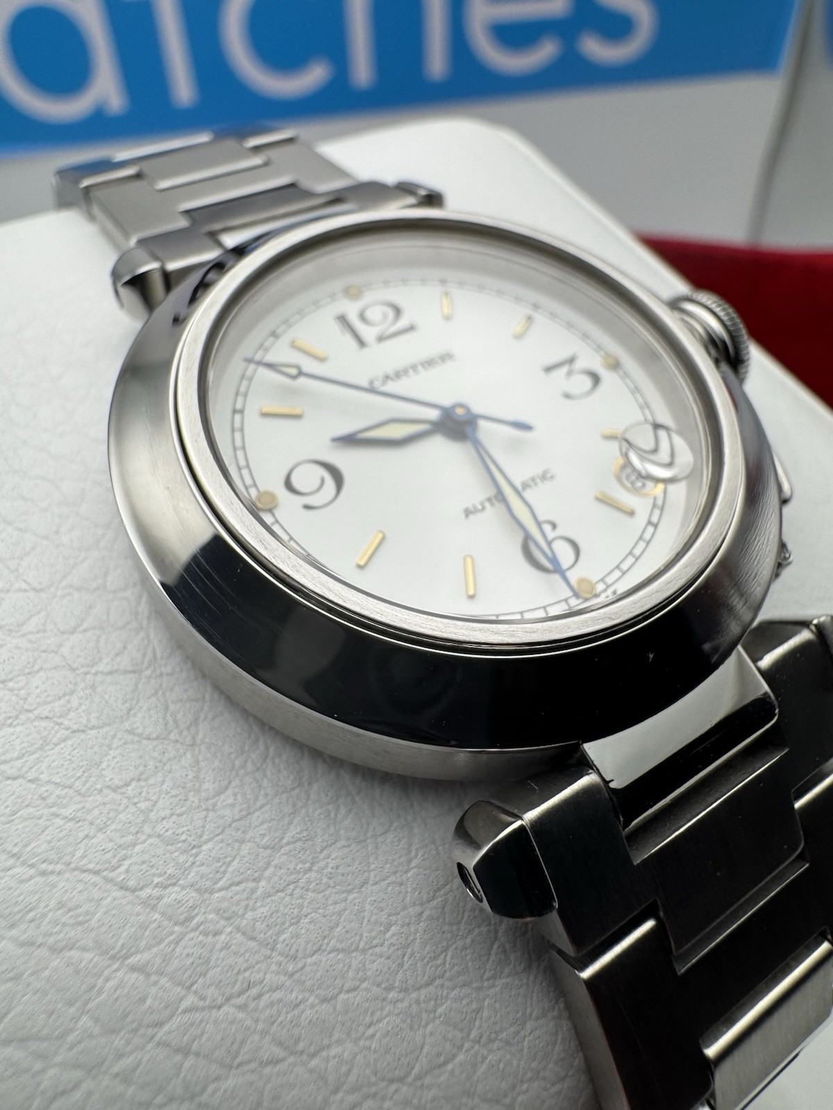 The Cartier Pasha C 2324 W31015M Automatic watch is a unisex wristwatch with a sleek silver stainless steel case and bracelet. Featuring a white dial with Arabic numeral and baton indexes, this Swiss-made timepiece exudes sophistication and style. With a water resistance of 100 meters, butterfly clasp closure, and date indicator, this watch is not only practical but also luxurious. The 35mm size makes it suitable for both men and women, while its self-winding mechanical movement ensures accurate timekeeping. Ideal for everyday wear or special occasions, the Cartier Pasha watch is a timeless piece with a touch of elegance.