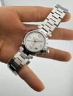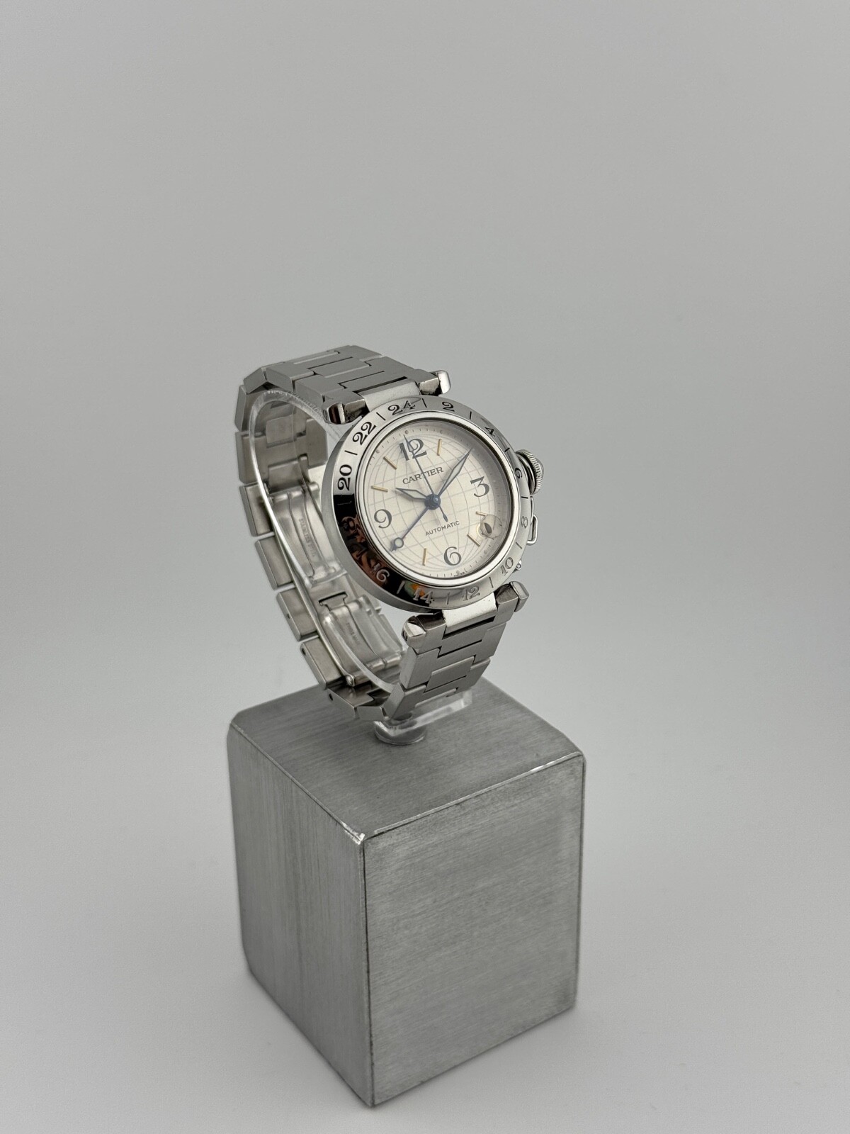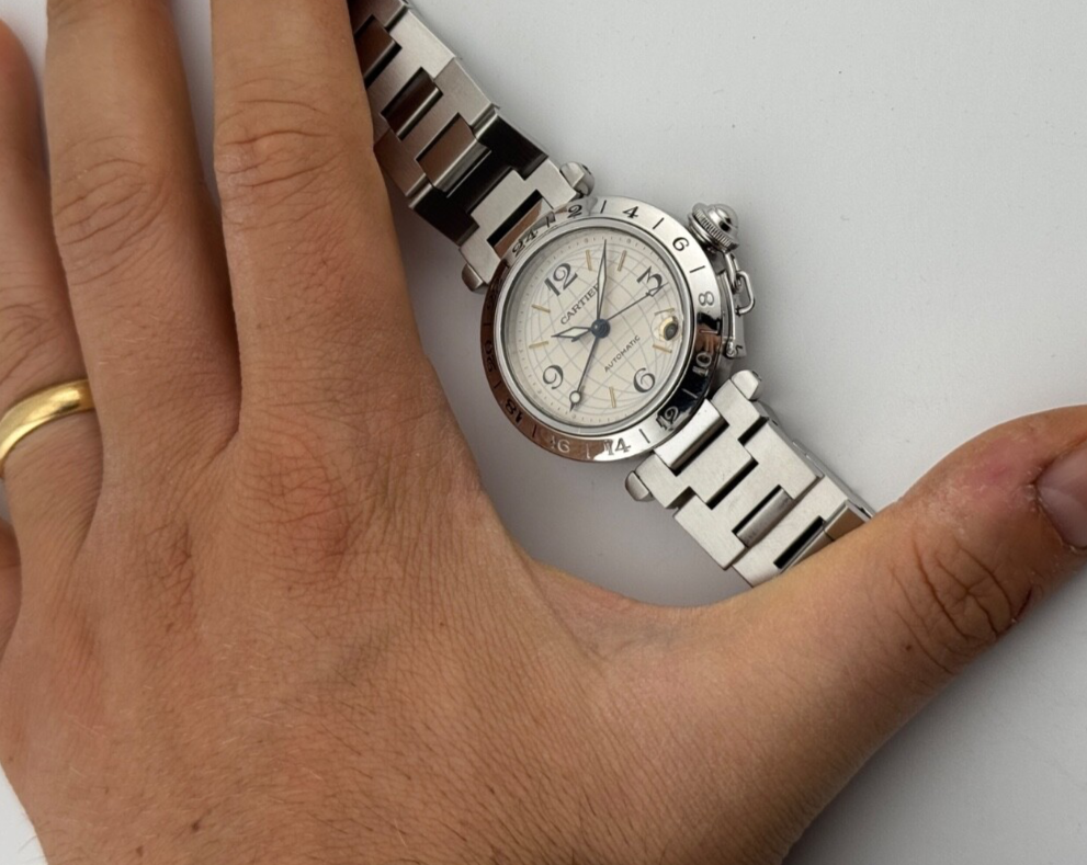 PROPONIAMO; -Marca: CARTIER PASHA C GMT 24 H -Cassa: ACCIAIO DA 35MM , FONDELLO ORIGINALE SERRATO CON 8 VITI -Movimento :ORIGINALE CARTIER 048 , COEVO IN TUTTE LE SUE PARTI -Vetro:ZAFFIRO ORIGINALE -Corona:ORIGINALE CON COPRI CORONA A VITE -Ghiera: LISCIA CON 24 H INCISE -Tasti: NO -Quadrante:MAPPAMONDO LUMINOVA -Lancette: ACCIAIO AZZURRATO , LUMINOVA -Cinturino/Bracciale: BRACCIALE ORIGINALE , CON DOPPIA CHIUSURA DEPLOYANTE -Scatola e documenti: NOSTRA POCHETTE IN VELLUTO COMPRESA + POCHETTE ORIGINALE CARTIER DA VIAGGIO -Condizioni : OTTIME -Revisionato:SI -Uomo/donna/unisex:UOMO PER QUALSIASI DUBBIO CONTATTATEMI ,RISPONDEREMO IL PRIMA POSSIBILE