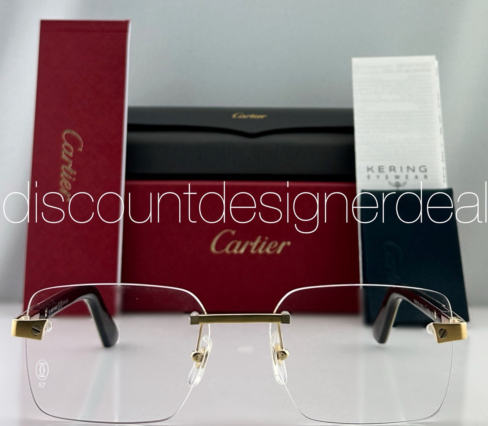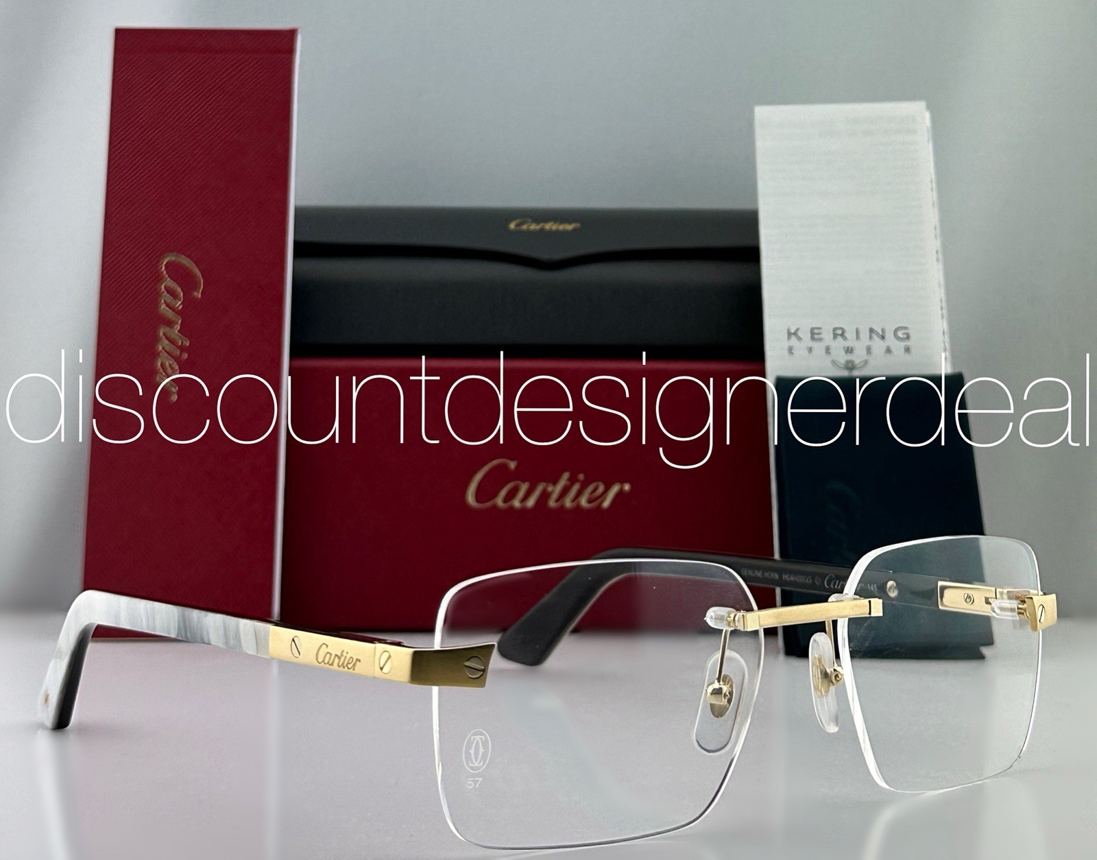 100% CUSTOMER SATISFACTION GUARANTEED Fast Free same day shipping Please visit our ebay page to see our wide selection of sunglasses and optical frames Brand new 100% Authentic Cartier Frameless eyeglasses genuine white buffalo horn, Gold metal accents and bridge clear demo lenses. Due to Buffalo horns natural patterns each items color is unique or may vary from photos above. (Lenses are only demo and must be changed to prescription lenses by the buyer). Comes with everything shown in images above including : Cartier box, case, cleaning cloth, booklet. Product Details : Style code : CT0411O Color Code / Description : 003 White buffalo horn temples, Gold metal accents Sizes : Lens size : 57 mm Lens height : 40 mm Bridge length : 18 mm Temple length : 145 mm Returns : Free 30 day money back guarantee on all our listings, however due to the high value of this item item must be in same exact condition as recieved with everything that was included with the item to avoid partial refund. SHIPPING : Same day shipping, 1-3 Day free priority mail or Registered mail. Signature tracking is required you must be available to sign for any package over 750$. We do not ship to different addresses that are on your ebay account, please make sure of the address you would like us to ship to before purchasing, Thank you. “Thank you for choosing Discountdesignerdeal for all your optical and sunglass needs, we strive to make all of our customers experiences a pleasant one”