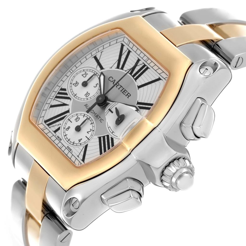 Cartier Roadster Chronograph Steel Yellow Gold Mens Watch W62027Z1 Cartier Roadster Chronograph Steel Yellow Gold Mens Watch W62027Z1 Click image to enlarge Description Swiss Watch Expo (404) 814-1814 Stock number 66383 Model number W62027Z1 Year Case number 2618 7215xxxx Gender Mens Movement Automatic self-winding movement with chronograph function. Case S tainless steel and 18K yellow gold tonneau shaped case 48 x 43 mm. Crystal Scratch resistant sapphire crystal with cyclops magnifying glass. Dial Silver sunray effect dial with black Roman numerals and three sub dials. Luminescent sword shaped black oxidized steel hands. Date window at 3 o'clock. Bracelet Stainless steel and yellow gold bracelet with hidden butterfly clasp. Fits 7 1/4" wrist. Condition Excellent condition Engravings None Box & papers Presentation non-Cartier box. Exclusive SwissWatchExpo Certificate of Authenticity. Authenticity 100% authentic. Our elite in-house team of Swiss-trained master watchmakers inspect and certify the authenticity and the condition of the watch. Working condition Timed to precision on Witschi watch expert timing machine. Running strong and keeping the accurate time. Warranty This watch is covered by Swiss Watch Expo's one year warranty on anything but abuse Pictures All the photos are of the actual watch for sale Payment - We ONLY accept payments in United States Dollars (USD). - Payments must be made within 5 days of winning the auction. Shipping Shipping Methods All shipments are sent fully insured, using the following carrier methods: * Domestic - UPS. * International - No international shipping available Terms of Sale 18 month Limited Warranty Swiss Watch Expo is honored to have the opportunity to serve you. That's why we stand by all of our products with a full 18 month limited warranty. If an item we sell you should fail as a result of a manufacturer's defect at any time during the first year and a half , we will repair or replace the item at absolutely no cost to you. Not covered by warranty: - Regular wear-and-tear from normal use. - External damage to the product. Any damages resulting from wear to the watch case, crystal/glass, watch bracelet, watch bezel, straps, screws, crown/stem, finishes, clasps/buckles, or any other physical damage to the watch. - defects caused by outside force or improper use. Consequential and incidental damages. - the loss of precious, semi-precious stones from settings. - Outside modifications and third party repair attempts of any kind will void the warranty. - Any damage if used under conditions which exceed the watch manufacturer?s water resistance guidelines. - Watches that are labeled as water resistant feature a screw down crown. The crown must be screwed down properly at all times to keep the watch casing watertight. Water damage is not covered under the warranty unless it is proven defective by the SwissWatchExpo Repair and service Center. Our 100% Money-Back Guarantee At Swiss Watch Expo, we understand that your purchase is a significant investment - one that you will pass down to future generations. That's why we're happy to give you a no-questions-asked money-back guarantee with no restocking fees. If you're not satisfied with your purchase, just let us know within 7 days after the purchase and we'll honor your return and issue a full refund, no questions asked. *Deductible amount for domestic shipping costs: $50 About Us This fine piece is a part of collection offered by Swiss Watch Expo , members of the National Association of Watch and Clock Collectors (NAWCC) and the International Watch and Jewelry Guild (IWJG). We are third generation jewelers who have been selling fine Swiss timepieces and elegant jewelry since 1982. We've built our reputation on quality, service and integrity, and we treat each customer with the utmost respect. We stand by all of our products with a generous warranty and guarantee, so you always know that when you bid with Swiss Watch Expo , you can can bid with confidence! About Swiss Watch Expo Thank you for the opportunity to serve you and welcome the Swiss Watch Expo ebay auction, where we proudly offer our collection of top quality Swiss timepieces and fine jewelry. We are third generation European trained master watchmakers and jewelry makers dealing in Fine Swiss watches, elegant gemstones and precious jewelry for nearly 30 years. Why You Should Choose Swiss Watch Expo Unlike many online resellers, at Swiss Watch Expo , we have built our business the old fashioned way - through our brick and mortar store in Atlanta, Georgia, providing our customers the very best products at an incredible value, while giving them the exemplary service they deserve. Now, as we serve the Ebay community, our commitment to the same philosophies holds true. We invite you to browse through our customer feedback to read about the experience others have had with us through Ebay. What Makes Swiss Watch Expo Products Better Than The Competition Every watch we sell has been completely inspected to ensure years of optimal functionality. What's more, there are never any middlemen involved in the process. From the time we purchase a watch, our experianced master watchmakers handle all repairs and restoration, making the watch as good as new. We've invested thousands into our state-of-the-art repair facility in order to carry out our commitment to quality. As for jewelry, every item is of the highest quality, using only the finest precious metals and gemstones available. When You Choose Swiss Watch Expo , You Have Nothing To Lose When you purchase an item from Swiss Watch Expo on Ebay, you have complete peace of mind. That's because we offer you a generous money-back guarantee without any restocking fee, no questions asked. Our philosophy is simple: By being committed to quality, service and value, we have satisfied customers who come back to us time and time again. Our entire staff is committed to providing you unparalleled quality and incompara
