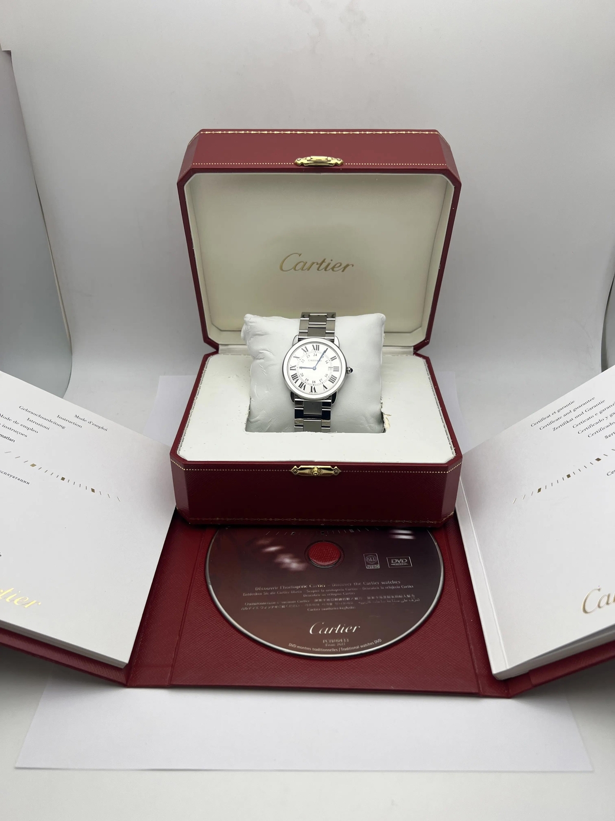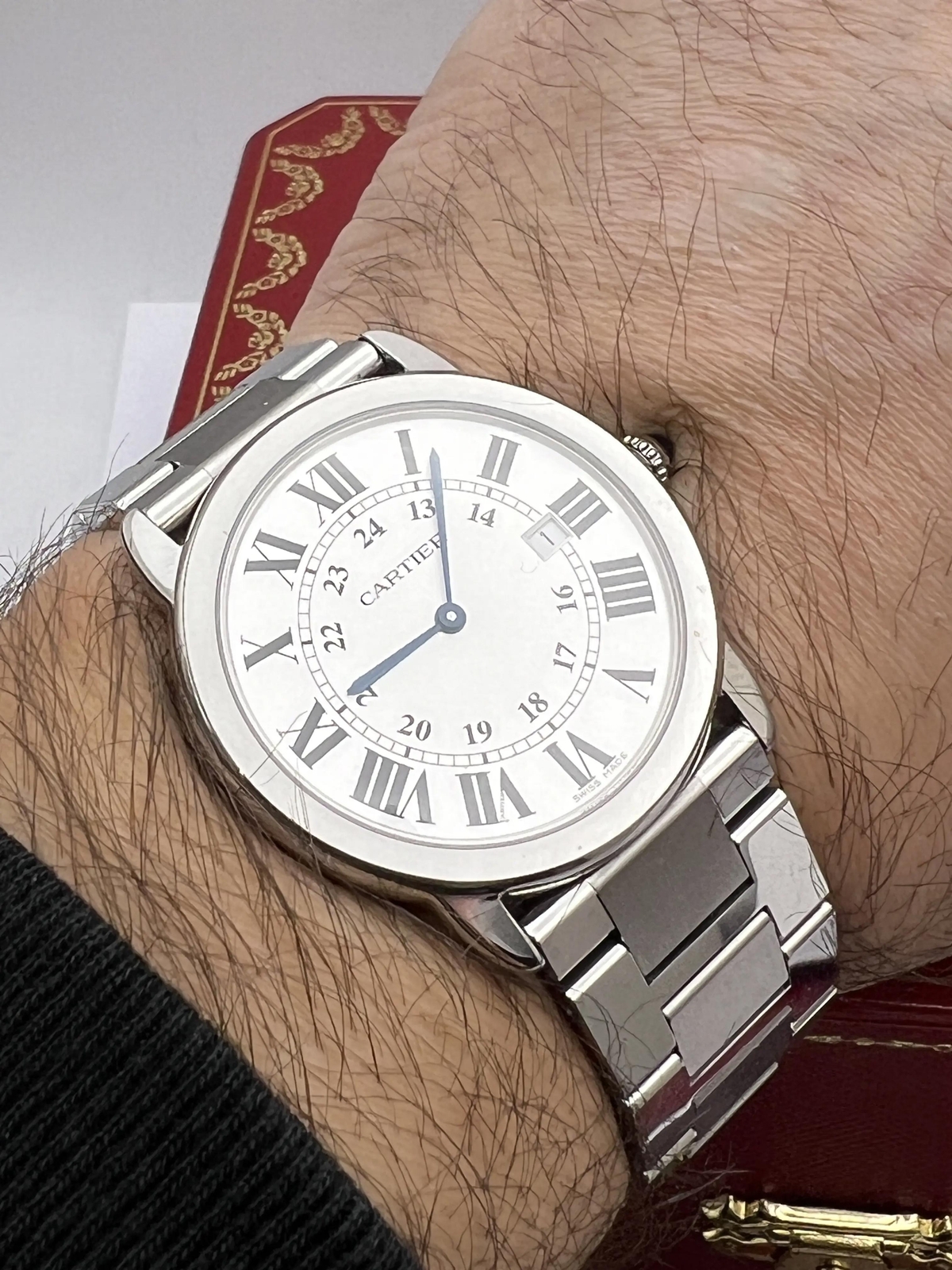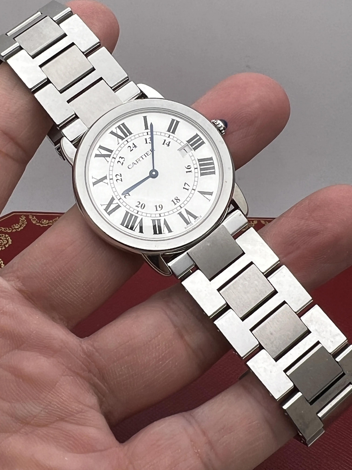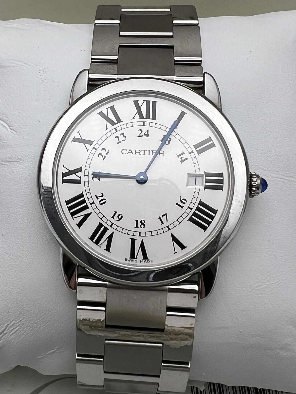 Cartier Ronde Solo 36mm Case, Stainless Steel Automatic Watch. Silver Dial with Black Roman Numerals with inner ring 24 hour arabic dial , blue sword hands and a date window. Blue cabochon on the crown adds the finishing cartier touch. Watch is polished and serviced to look as new prior to ship. Come with box and papers, 1 year seller warranty. Cartier Rondo Solo 36mm W6701005 Quartz Silver Dial Watch Box Papers Description Cartier Ronde Solo 36mm Case, Stainless Steel Automatic Watch. Silver Dial with Black Roman Numerals with inner ring 24 hour arabic dial , blue sword hands and a date window. Blue cabochon on the crown adds the finishing cartier touch. Watch is polished and serviced to look as new prior to ship. Come with box and papers, 1 year seller warranty. Ships from Address 608 5th Ave, STE 406 - New York NY, 10020 Phone 16466697750 Condition Pre Owned Highlights Case Size 36 mm Wrist Fit 6.75 inch Box Yes Papers Yes SKU 000615 General Info MSRP 5800 Brand Cartier Type Wristwatch Department Unisex Adult Model Number W6701005 Country/Region of Manufacture Switzerland Style Luxury Model Cartier Ronde Solo Features/Other Details Year Manufactured 2013 Customized No With Original Packaging Yes With Booklet Yes With Papers Yes Seller Warranty Yes SKU 000615 Features Date Indicator, Fixed Bezel, Push/Pull Crown, Sapphire Crystal, Scratch-Resistant, Shock-Resistant, Splash Proof, Swiss Made, Swiss Movement Band/Bracelet Details Band Color Silver Band Material Stainless Steel Closure Butterfly Clasp Band Type Bracelet Band Width 20 mm Lug Width 25 mm Wrist Fit 6.75 inch Case Details Case Material Stainless Steel Case Color Silver Watch Shape Round Caseback Solid Case Finish Polished Case Size 36 mm Case Thickness 6 mm Bezel Details Bezel Type Fixed, Smooth Bezel Color Silver Display Dial Color Silver Display Analog Indices Arabic Numerals, Roman Numerals Movement Movement Quartz Shipping Warranty Return Policy FAQ We take all steps to make shipping as seamless and secure for both us as the seller and you as the buyer. We ship all items via Federal Express, all items require signature on delivery to confirm receipt of the package. Furthermore, most higher priced watches sold on eBay go through the authentication program where we ship the watch to eBay and they then send it along to you after passing their authentication and certification process. This ensures that you are receiving exactly what you bought as described for a worry free transaction process. Unless otherwise stated most new items carry the manufacturer warranty from the date of the original sale. This tends to be more often than not within one year of the date sold by us on eBay. If no warranty is implicitly described we warranty against any defects in mechanical workmanship for up to one year from purchase. Accidental damage, wear and tear, third-party modification or service and/or improper use are not covered and will void the warranty, repairs can still be performed at a cost. Pre-owned watches will list what manufacturer warranty, if any, applies. If not listed they will default to our 1 year from date of purchase warranty. Warranty covers labor only, parts, if any required, are subject to a charge at cost. Warranty repairs are subject to shipping charges, local drop off and pickup is available. Even outside of a warranty period we can always provide top quality service and very competitive pricing for service, repair and/or refinishing by our Watchmakers trained and specialized in Swiss Mechanical Watches. Most items have a worry free 14 day return policy. All items are photographed and described accurately and shipped in the condition described. Any signs of wear will void any return privileges, the watch must be returned in the condition received, in working order and free from signs of use and wear. The packaging process is under constant video surveillance and securely sealed in its packaging box. Should you need to return the item please reach out to us first so we may assist you in that process if there is anything that is needed as well as to guide you on the process to ship us back something securely. Q: How may we contact you? A: We are available through ebay messaging, phone or in office as well as on social media. Chrono On Fifth LLC 608 5th Ave STE 406 New York, NY 10020 tel 646 669 7750 IG: @ChronoOnFifth Q: Are all of the items listed original and authentic? A: Yes! All of our items are guaranteed authentic. Very few items may be customized (Bezels, Dials, Custom set diamonds etc) and they are clearly and accurately described as such. We only source from reputable sources in the industry and items pass through multiple layers of authentication. In the rare event some parts that are no longer produced and a repair is required these may be used but are 100% matches to OEM specificities. About Us Over 30 years in Jewelry and Watches business, located on the world renown Fifth Ave in the heart of Midtown Manhattan, Chrono On Fifth specializes in Selling and Buying luxury Swiss watch brands such as Rolex, Audemars Piguet, Patek Philippe, IWC, Hublot, Omega, Panerai, Chopard, Cartier, Bvlgari amongst many others. We are your one stop shop for Buying, Selling or Repairing your wristwatch. We source all of our watches from reputable sources worldwide to bring you the lowest prices and guaranteed authentic items. All watches are inspected upon receipt before we make them available for sale. Just a few steps away from Rockefeller Plaza and across from Saks Fifth Ave you can feel comfortable and safe shopping in our private office or through the phone or web. Please reach out anytime should you want to buy or sell or trade any timepiece as well as repair or service your watch if needed. Please schedule an appointment if you would like to come into the office in person and view an item in our private showroom. Call or message us about your trade in or any other questions you may have! Chrono On Fifth LLC 608 5th Ave