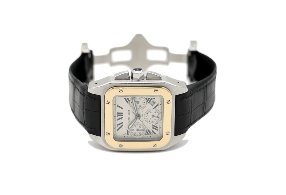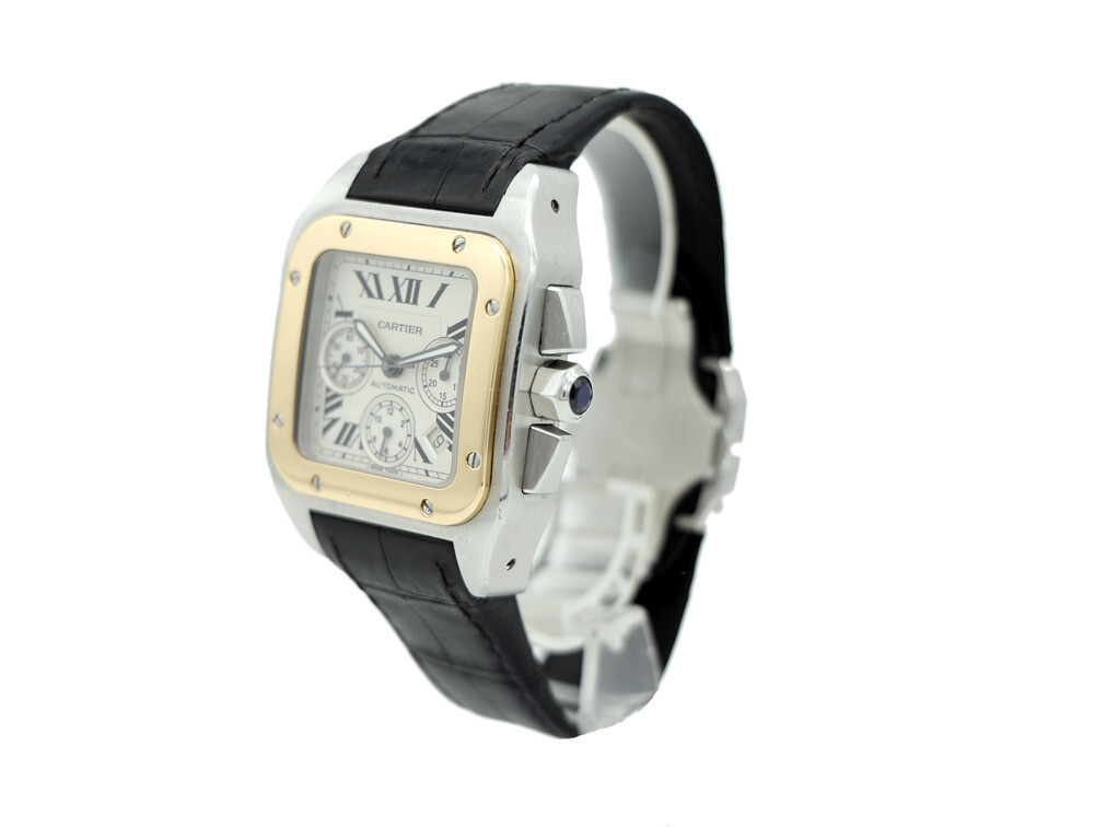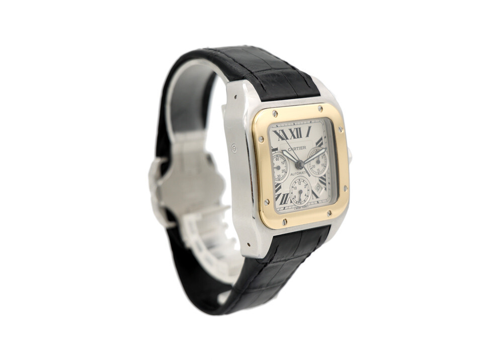 Cartier Santos 100 XL Chronograph 18k Gold and Stainless Steel Watch The Cartier Santos is recognized as the first true Cartier wristwatch. Named after Alberto Santos-Dumont, a dashing Brazilian aviator, the Cartier Santos series was introduced in 1904. Jeweled Cartier Santos wristwatches soon followed after the success of the original Santos. Louis Cartier later created and patented the deployment-folding clasp for the Cartier Santos series in 1910. With an exquisite geometric form and round corners, the Cartier Santos watch shows sturdiness and beautiful workmanship that will always be considered classic Cartier sophistication. This beauty is in a great condition as you can see in the pictures. The watch looks great and keeps excellent time. Comes with the original box and the booklet.