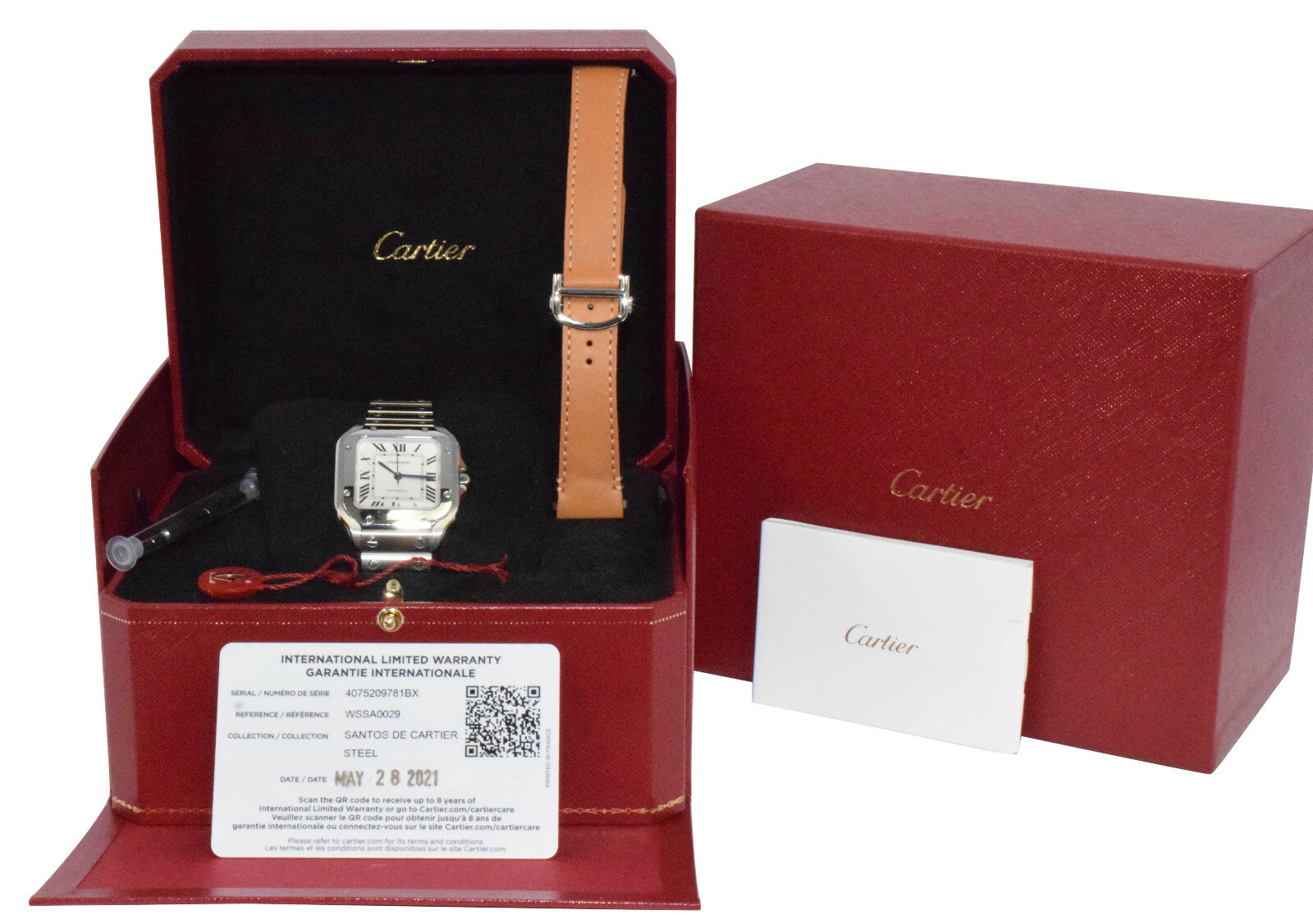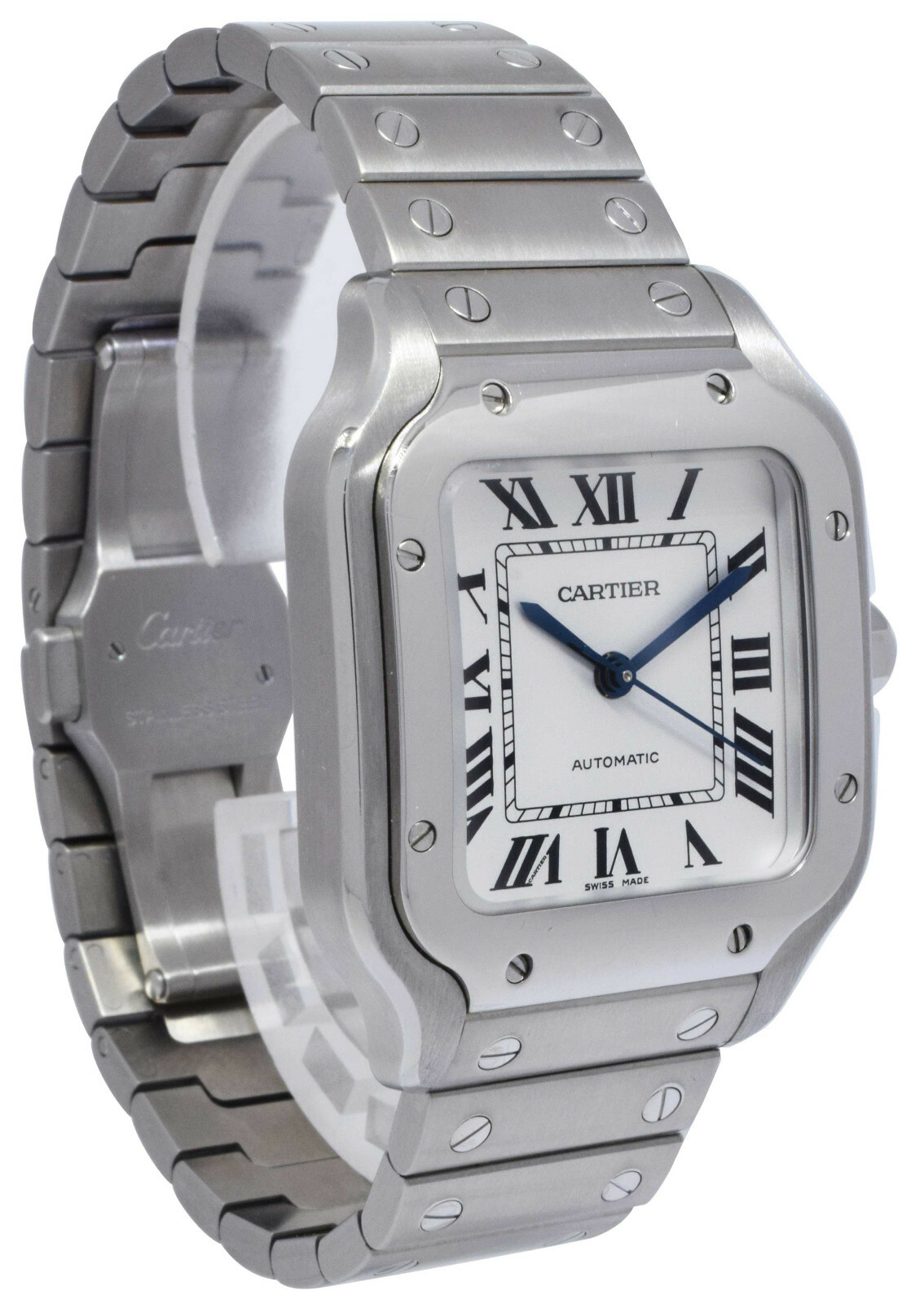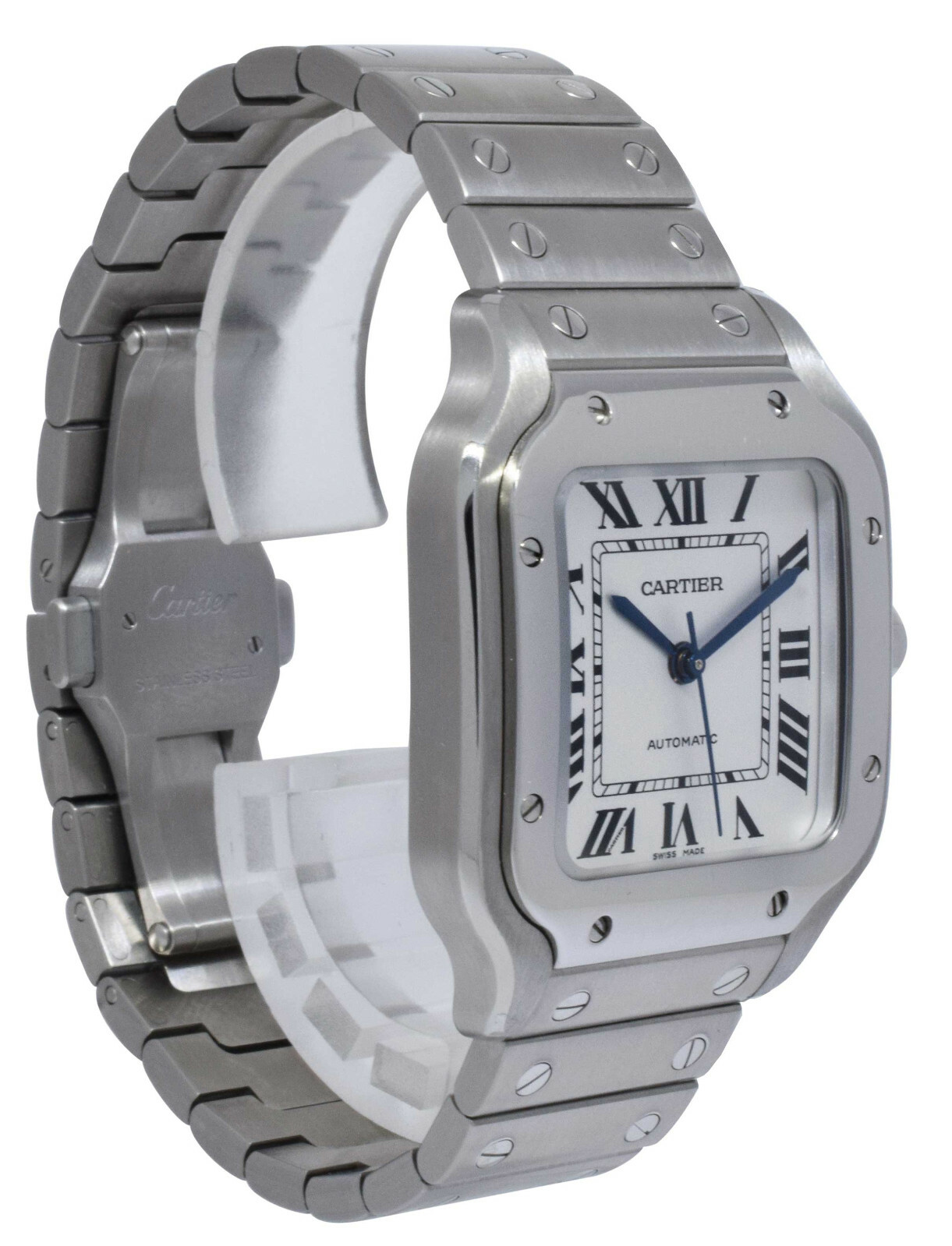 CARTIER Santos W4SA0005 Ref 4075 FACTORY DIAMOND BEZEL Stainless Steel Medium The CARTIER Santos W4SA0005 Ref 4075 is a stylish unisex wristwatch featuring a square stainless steel case with a silver bezel and band. This mechanical (automatic) timepiece is from the Cartier Santos de Cartier collection, showcasing a 35mm case size and analog display. The watch is a luxurious accessory perfect for those who appreciate quality craftsmanship and a classic design. CARTIER Santos W4SA0005 Ref 4075 35mm Stainless Steel Caze Size Medium Model Stainless Steel Band Original Factory Diamond Bezel MSRP $13,100