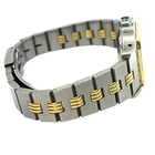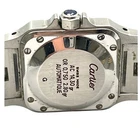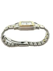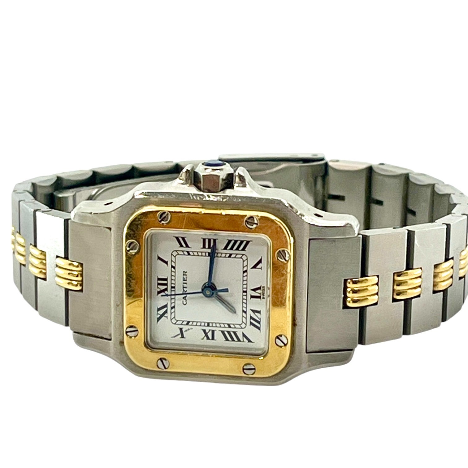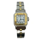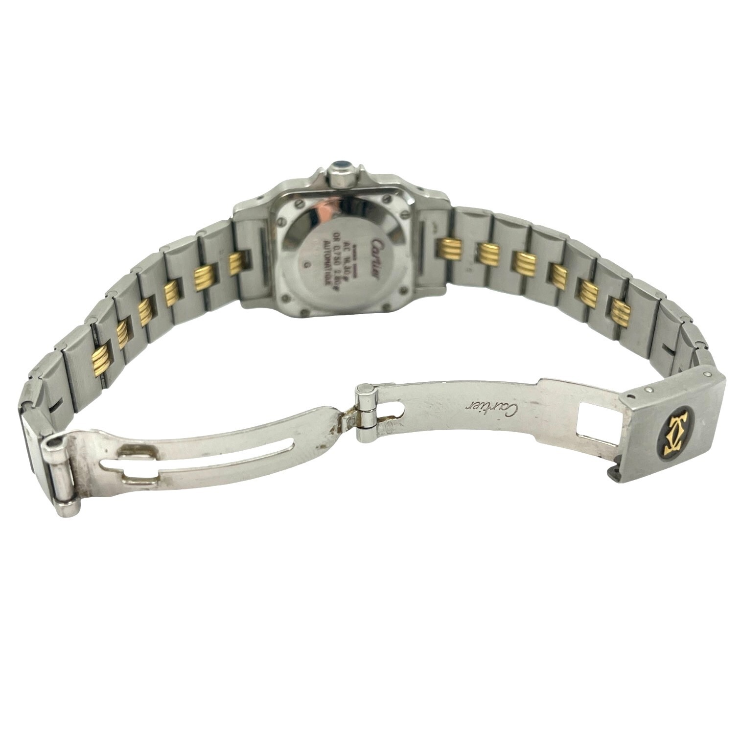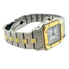 This Cartier Santos Carree Godron Steel Gold Auto Lady's Watch is a vintage timepiece manufactured between 1980-1989. The watch features a square shape with a 24mm case size and a bracelet band with a lug width of 18mm. The case is made of stainless steel and yellow gold, with a brushed case finish. The watch displays an analog system with Roman Numerals indices on a white dial. It comes with a screwback caseback and sapphire crystal. The watch is water-resistant up to 30m (3 ATM) and is powered by a quartz movement. This Cartier Santos watch is a perfect combination of classic and luxury style, suitable for both casual and dress/formal occasions. lot#jackjoann