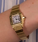 Cartier Santos Galbée 24mm lady's yellow gold automatic bracelet watch. 18k Yellow Gold 23.5mm case, white dial, Roman numerals, sapphire crystal blue cabochon winder, Cartier Santos 18 yellow gold bracelet and deployant clasp, automatic movement. Approx. 101 g. Fits approx. a 176mm wrist. The watch was serviced by Cartier in 2024 and the service includes a 24-month Cartier global warranty. There is a scuff to the upper-handside screw area. Unlike other sellers, we do not edit blemishes or artificially enhance our product images with Photoshop or other software. What you see is what you get. Our watches are covered by eBay Authenticity Guarantee. When you buy a watch from us eBay authenticates it for free before it is shipped to you. Please see more information here: https://pages.ebay.co.uk/authenticity-guarantee-watches/