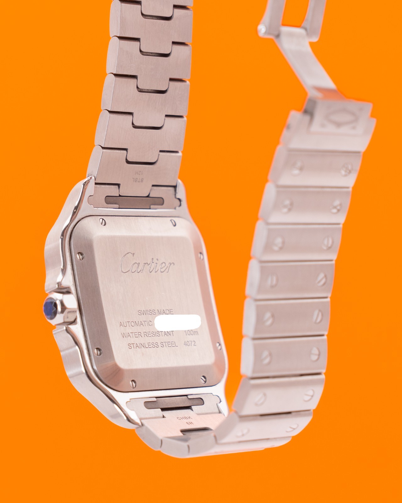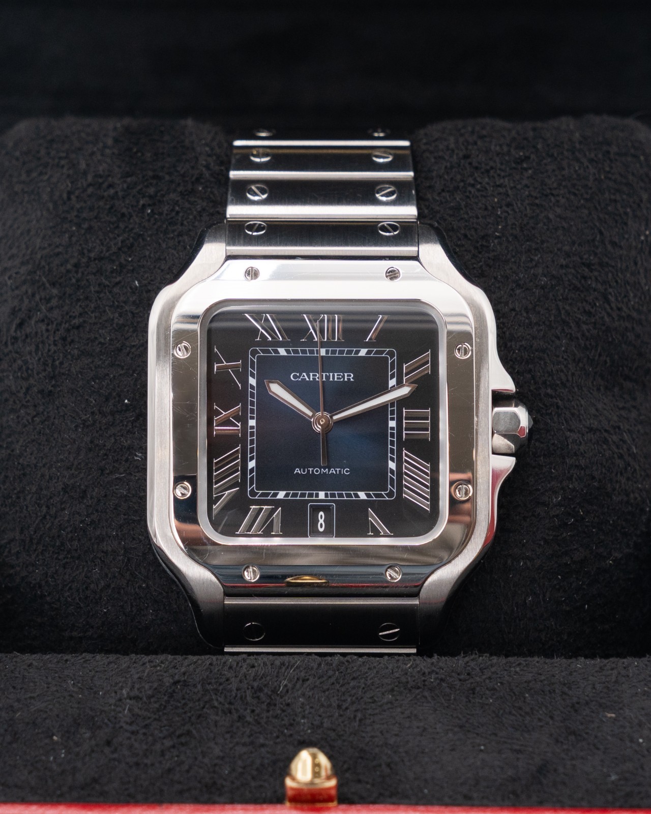 Brand: Cartier Model: Santos Large Reference Number: WSSA0030 Materials: Steel Case diameter: 39.8mm Movement: Automatic Condition: Very Good Year of Production: 2022 Box: Yes Papers/Warranty Card: Yes Booklets: Yes ID : 60488 The Cartier Santos de Cartier (model WSSA0030) delivers a refined yet modern take on one of the brand’s most iconic timepieces. With a case size of 39.8mm in stainless steel, this watch balances a robust presence on the wrist with Cartier’s signature elegance. Its rich blue sunray-brushed dial provides a contemporary contrast to the classic Roman numerals and sword-shaped hands, which are coated with luminescent material for improved legibility. The bezel's exposed screws and the square case design echo the original 1904 aviation-inspired aesthetic, paying homage to the heritage of the Santos line. Powering the watch is Cartier’s in-house caliber 1847 MC, an automatic movement offering solid precision and reliability with anti-magnetic components and a 42-hour power reserve. The steel bracelet includes Cartier’s patented QuickSwitch system for easy strap changes, and a SmartLink system that allows tool-free resizing. Water-resistant to 100 meters (10 bar), this version of the Santos is as practical as it is stylish, making it a versatile choice for both everyday wear and more formal occasions.