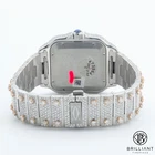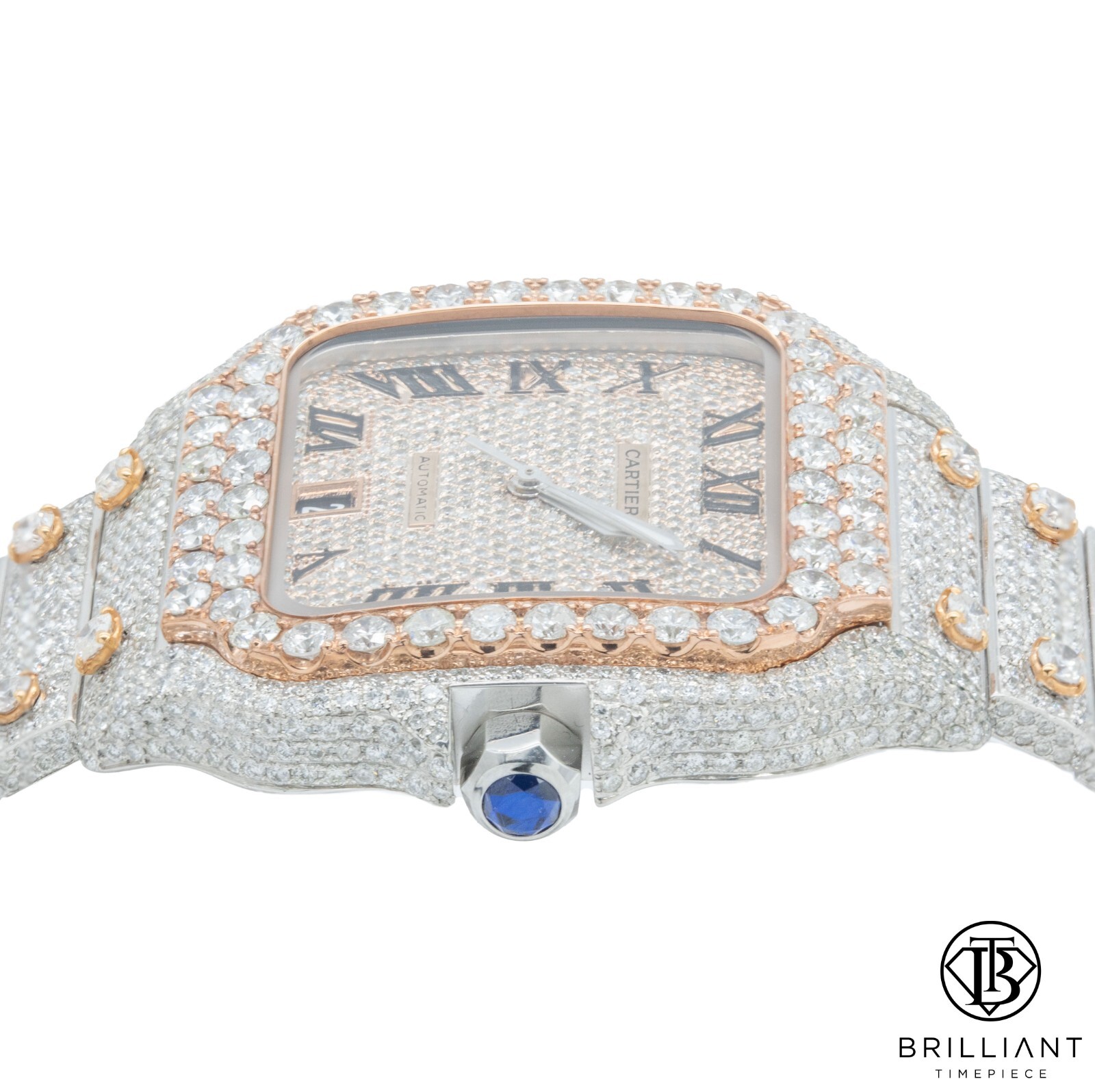 Band Type: Stainless Steel/Rose Gold Brand: Cartier Case Color: White Steel Case Finish: Polished Case Material: Stainless Steel Case Size: 40 mm Certificate: Yes Certification: Triple A (AAA GEM LAB) Dial Color: Silver Dial Style: Iced Out Roman Numeral Display: Analog Gender: Unisex Main Stone: Diamonds Model: Santos de Cartier Large Movement: Original Cartier Movement Seller Notes: Pre-Owned watch which has been upgraded. This pre-owned time piece has been refurbished and serviced by a certified watchmaker. Including movement overhaul and buff/polish. All diamonds are added aftermarket (unless otherwise stated). All customizations are listed in the description. The watch will come mint condition. Diamonds are all set by Brilliant Timepiece NYC. Type of Certificate: Certificate of Authenticity