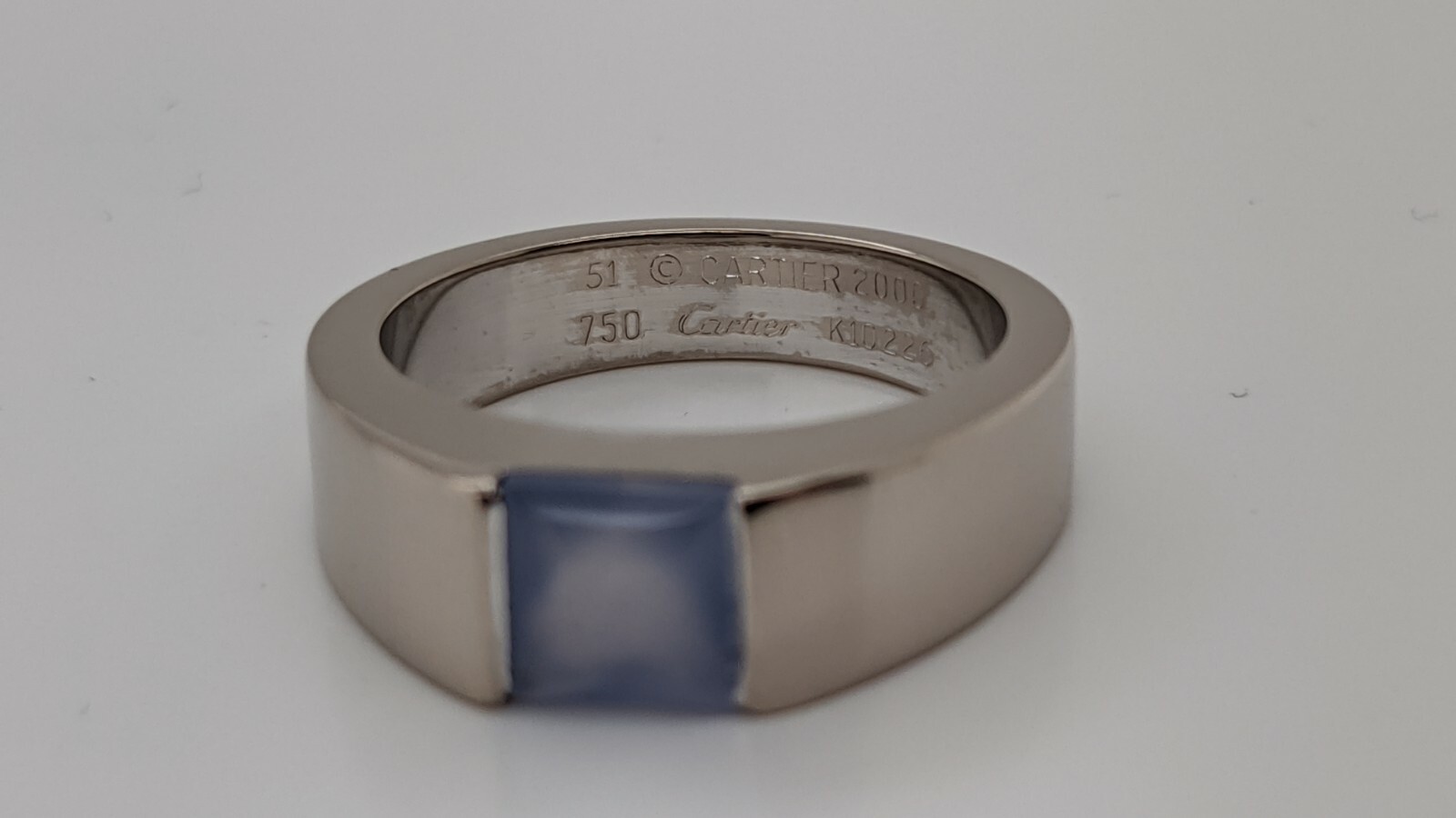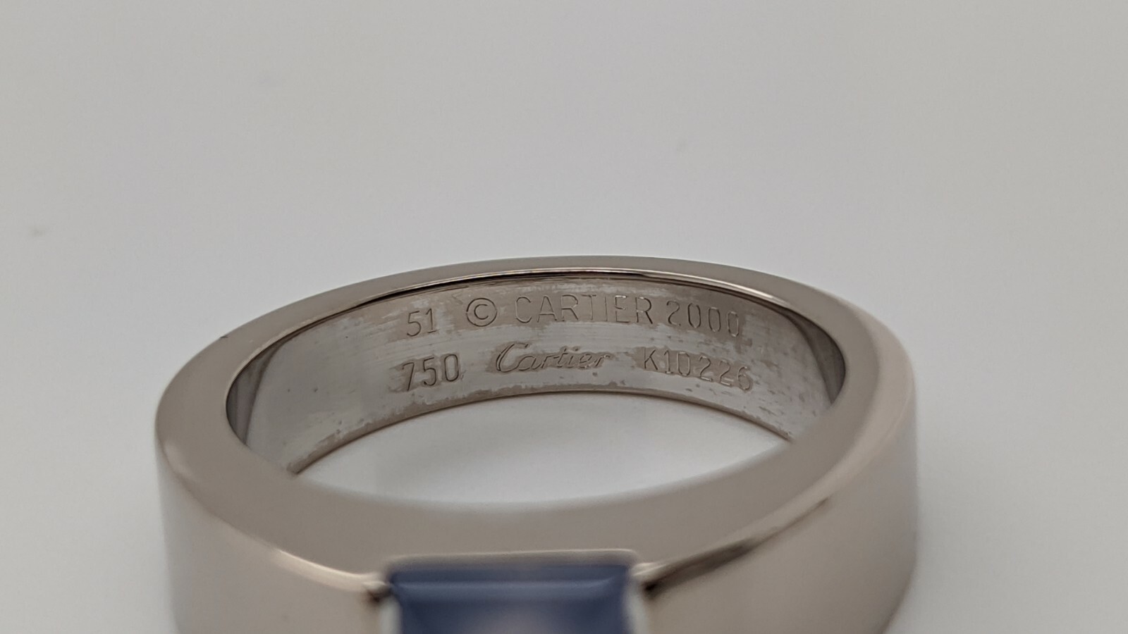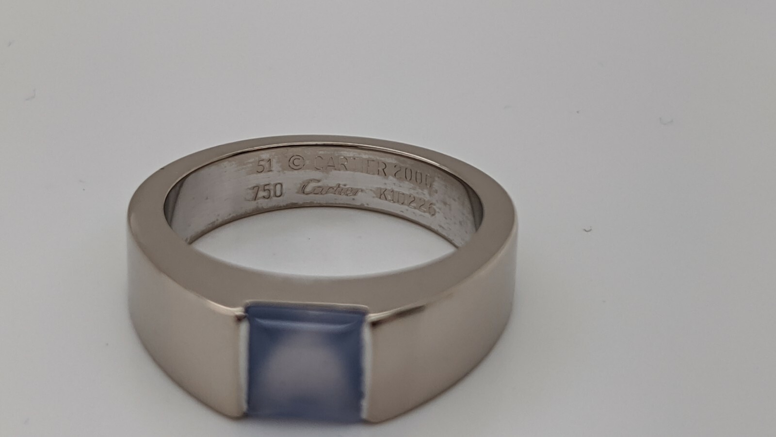 Welcome to my e B a y Store 2000 Cartier Tank 18K White Gold Blue Cabochon Band Ring Ring Size 51mm | US Size 5.75 Band Width - 4mm Total Weight - 10.1 Grams Great Vintage & Professionally Polished Pouch NOT Included Bid With Confidence Feel Free to ask any questions before bidding please If you would like additional pictures please send me a message Check out my other listings for more great deals! 100% Authentic or your Money Back Guarantee!! Free Shipping on All Items!