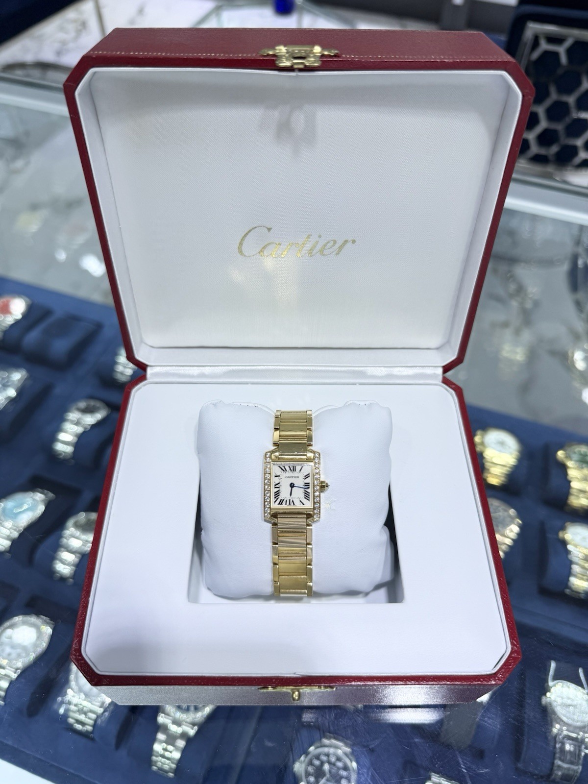 This Cartier Tank Francaise is pure elegance! The 18ct yellow gold and factory diamonds add a luxurious touch, while the classic design stays timeless. Light wear is minimal, and it comes with original boxes, certification, and a 3-year warranty—fantastic for a pre-owned piece. The 7" wrist size fits comfortably, and FedEx overnight shipping ensures it arrives safely. A stunning investment from a trusted jeweler!