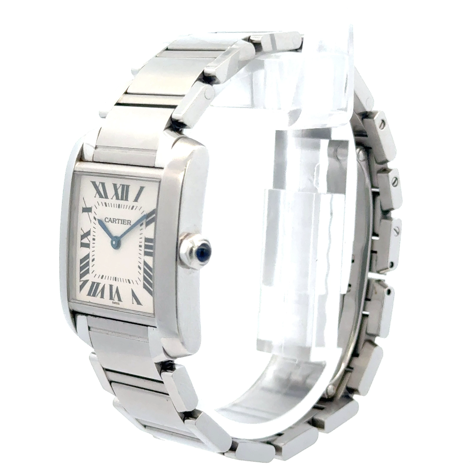 This Cartier Tank Française wristwatch features a silver stainless steel case and band, with a silver dial and Roman numeral indices. It is a mid-size watch with a square shape, measuring 25MM x 30MM in case size. The movement is quartz and the water resistance is 30m (3 ATM). This Cartier Tank watch has a date indicator and is suitable for both dress/formal and casual styles. It is a unisex watch that will make a great addition to any collection. The reference number is W51011Q3 and the dealer code is 13674. This wristwatch is not handmade and does not come with papers, service records, original box/packaging, or manual/booklet. The Clockman Watches and Jewelry 205 W Commonwealth Ave Fullerton Ca 92832 714-578-0089 Monday Thru Friday 10:00 to 5:30 Saturday 10:00 to 2:00