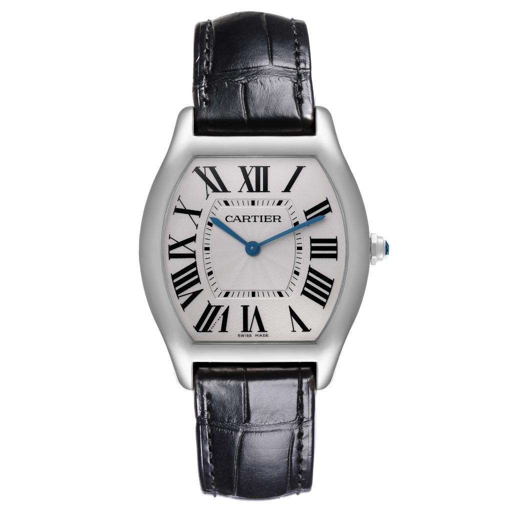 Cartier Tortue Large White Gold Silver Dial Mens Watch WGTO0003 Cartier Tortue Large White Gold Silver Dial Mens Watch WGTO0003 Click image to enlarge Description SwissWatchExpo (404) 814-1814 Stock number 65466 Model number WGTO0003 Serial number 3798 364xxxx Retail $24,100.00 Year Gender Mens Movement Manual-winding movement. Jewels 18 Caliber 430 MC Case 18K white gold tonneau-shaped case 34.5 x 43.0 mm. Octagonal crown set with a faceted blue spinel. Crystal Scratch resistant domed sapphire crystal. Dial Silver dial with painted black Roman numeral hour markers. Blue sword-shaped hands. Secret signature at VII. Bezel 18K white gold bezel. Bracelet Black leather strap with an 18k white gold deployant clasp. Condition Excellent condition. Engravings None Box & papers Cartier box. Authenticity 100% authentic. Working condition Timed to precision on Witschi watch expert timing machine. Running strong and keeping the accurate time. Warranty This watch is covered by Swiss Watch Expo's one-year warranty on anything but abuse. Pictures All the photos are of the actual watch for sale. Payment - We ONLY accept payments in United States Dollars (USD). - Payments must be made within 5 days of winning the auction. Shipping Shipping Methods All shipments are sent fully insured, using the following carrier methods: * Domestic - UPS. * International - No international shipping available Terms of Sale 18 month Limited Warranty Swiss Watch Expo is honored to have the opportunity to serve you. That's why we stand by all of our products with a full 18 month limited warranty. If an item we sell you should fail as a result of a manufacturer's defect at any time during the first year and a half , we will repair or replace the item at absolutely no cost to you. Not covered by warranty: - Regular wear-and-tear from normal use. - External damage to the product. Any damages resulting from wear to the watch case, crystal/glass, watch bracelet, watch bezel, straps, screws, crown/stem, finishes, clasps/buckles, or any other physical damage to the watch. - defects caused by outside force or improper use. Consequential and incidental damages. - the loss of precious, semi-precious stones from settings. - Outside modifications and third party repair attempts of any kind will void the warranty. - Any damage if used under conditions which exceed the watch manufacturer?s water resistance guidelines. - Watches that are labeled as water resistant feature a screw down crown. The crown must be screwed down properly at all times to keep the watch casing watertight. Water damage is not covered under the warranty unless it is proven defective by the SwissWatchExpo Repair and service Center. Our 100% Money-Back Guarantee At Swiss Watch Expo, we understand that your purchase is a significant investment - one that you will pass down to future generations. That's why we're happy to give you a no-questions-asked money-back guarantee with no restocking fees. If you're not satisfied with your purchase, just let us know within 7 days after the purchase and we'll honor your return and issue a full refund, no questions asked. *Deductible amount for domestic shipping costs: $50 About Us This fine piece is a part of collection offered by Swiss Watch Expo , members of the National Association of Watch and Clock Collectors (NAWCC) and the International Watch and Jewelry Guild (IWJG). We are third generation jewelers who have been selling fine Swiss timepieces and elegant jewelry since 1982. We've built our reputation on quality, service and integrity, and we treat each customer with the utmost respect. We stand by all of our products with a generous warranty and guarantee, so you always know that when you bid with Swiss Watch Expo , you can can bid with confidence! About Swiss Watch Expo Thank you for the opportunity to serve you and welcome the Swiss Watch Expo ebay auction, where we proudly offer our collection of top quality Swiss timepieces and fine jewelry. We are third generation European trained master watchmakers and jewelry makers dealing in Fine Swiss watches, elegant gemstones and precious jewelry for nearly 30 years. Why You Should Choose Swiss Watch Expo Unlike many online resellers, at Swiss Watch Expo , we have built our business the old fashioned way - through our brick and mortar store in Atlanta, Georgia, providing our customers the very best products at an incredible value, while giving them the exemplary service they deserve. Now, as we serve the Ebay community, our commitment to the same philosophies holds true. We invite you to browse through our customer feedback to read about the experience others have had with us through Ebay. What Makes Swiss Watch Expo Products Better Than The Competition Every watch we sell has been completely inspected to ensure years of optimal functionality. What's more, there are never any middlemen involved in the process. From the time we purchase a watch, our experianced master watchmakers handle all repairs and restoration, making the watch as good as new. We've invested thousands into our state-of-the-art repair facility in order to carry out our commitment to quality. As for jewelry, every item is of the highest quality, using only the finest precious metals and gemstones available. When You Choose Swiss Watch Expo , You Have Nothing To Lose When you purchase an item from Swiss Watch Expo on Ebay, you have complete peace of mind. That's because we offer you a generous money-back guarantee without any restocking fee, no questions asked. Our philosophy is simple: By being committed to quality, service and value, we have satisfied customers who come back to us time and time again. Our entire staff is committed to providing you unparalleled quality and incomparable service. We hope that we have the opportunity to provide you with the same experience our loyal customers have come to expect from Swiss Watch Expo. Images sell! Get Supersized Images & Free Image Hosting Create your brand with A