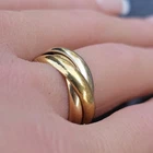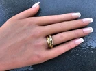 This stunning Cartier Trinity Wedding Band Ring is a true symbol of love and elegance. Crafted from 18k gold, this tri-color rolling ring features a beautiful band design that is perfect for any wedding occasion. With a ring size of 5.25, this ring is a true fit for any finger. The ring is designed with a multi-tone gold finish that adds a touch of sophistication to any outfit. The Cartier brand is synonymous with quality and luxury, making this ring a must-have for anyone who wants to make a statement. Whether you're looking for a wedding band or simply a beautiful piece of jewelry, this Cartier Trinity Wedding Band Ring is sure to impress. More details: Metal: 18k tri color gold Measurements: size 50 (US 5.25) each band is 4mm wide, while on the finger the total width is ~9mm Weight: 11.1 grams Condition: Very good used condition with just light scratches from regular use. No damage or issues. See pictures and video for exact condition. Stock #: FRR