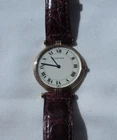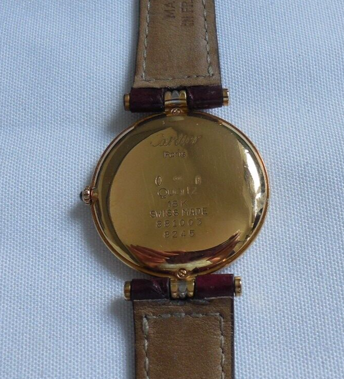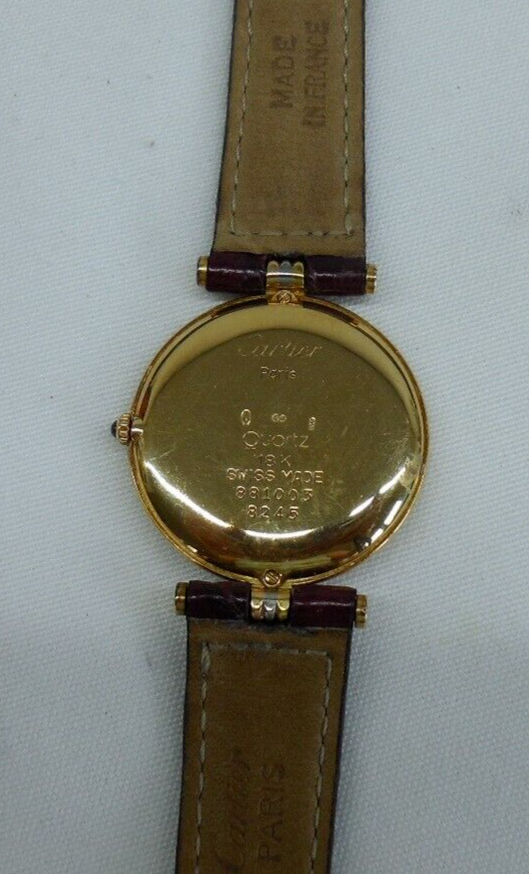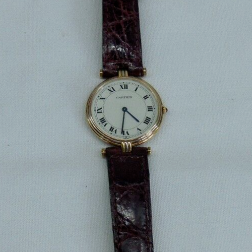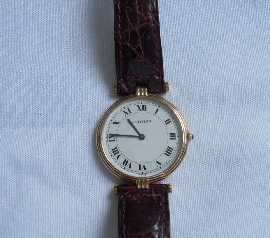 Cartier Vendome 18ct Gold (tricolour gold) Unisex Quartz Watch Purchased from Mappin & Webb in 2006, this Cartier Vendome wristwatch is a luxurious accessory. It features a two-piece Cartier leather strap in brown, a white dial with Roman numeral indices, and a fixed gold bezel. The case is made of a combination of white, rose, and yellow gold, with a polished finish. This Swiss-made watch has a quartz movement, a 12-hour dial. It comes with features like sapphire crystal, a screwback caseback, and is sold without any manual or booklet. The Cartier Vendome is a timeless piece, manufactured between 1990-1999, and is perfect for those who desire a classic and elegant watch. diameter excluding the crown is 30mm. Postage RM Special delivery