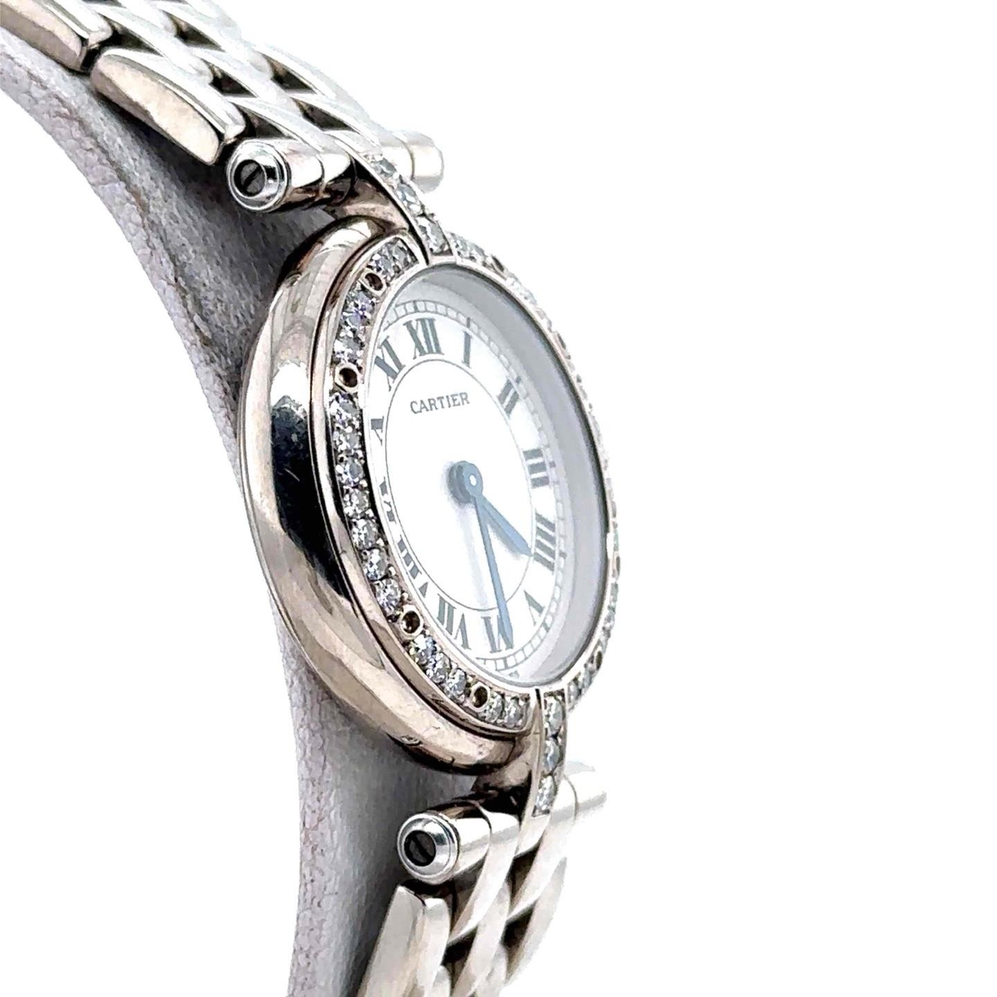 Cartier Vintage Panthere Vendome Quartz 22mm 18k WhiteGold Diamond Bezel 3057916 Cartier Vintage Panthere Vendome Quartz 22mm 18k WhiteGold Diamond Bezel 3057916 Description FITS UP TO 6.5+ INCH WRIST // WEIGHS 68.6 GRAMS White gold-tone 18kt white gold case with a 18kt white gold bracelet. Fixed white gold-tone bezel with diamond set 18kt white gold. Silver-tone dial with blued-steel sword-shaped hands and Roman numeral hour markers. Dial Type: Analog. Quartz movement. Scratch resistant sapphire crystal. Pull / push crown. Solid case back. Round case shape, case size: 22 mm, case thickness: 5 mm. Band width: 12 mm. Hidden clasp. Water resistant at 30 meters / 100 feet. Functions: hour, minute. Panthere Vendome Series. Luxury watch style. Watch label: Swiss Made. Pre-owned Cartier Panthere Vendome Quartz Diamond Silver Dial Ladies Watch 3057916. General Collection Name Panthere Vendome Information Brand Cartier Model 3057916 Gender Womens Watch Label Swiss Made Movement Quartz Condition Information Box No Preowned Item Condition Excellent Papers No Year 1988 Case Case Diameter 22 mm Case Thickness 5 mm Case Material 18kt White Gold Case Shape Round Case Back Solid Dial Type Analog Dial Color Silver-tone Crystal Scratch Resistant Sapphire Hands Blued-steel Sword-shaped Dial Markers Roman Numeral Bezel Fixed Bezel Color White Gold-tone Bezel Material Diamond Set 18kt Yellow Gold Crown Pull / Push Band Band Type Bracelet Band Material 18kt White Gold Band Color Yellow Band Width 12 mm Clasp Hidden Features Water Resistance 30 meters / 100 feet Functions Hour, Minute Watch Features Diamond, Gold, Analog B58755 PPPQRU 300+ Listing Templates! Auctiva gets you noticed! The complete eBay Selling Solution. Track Page Views With Auctiva's Counter