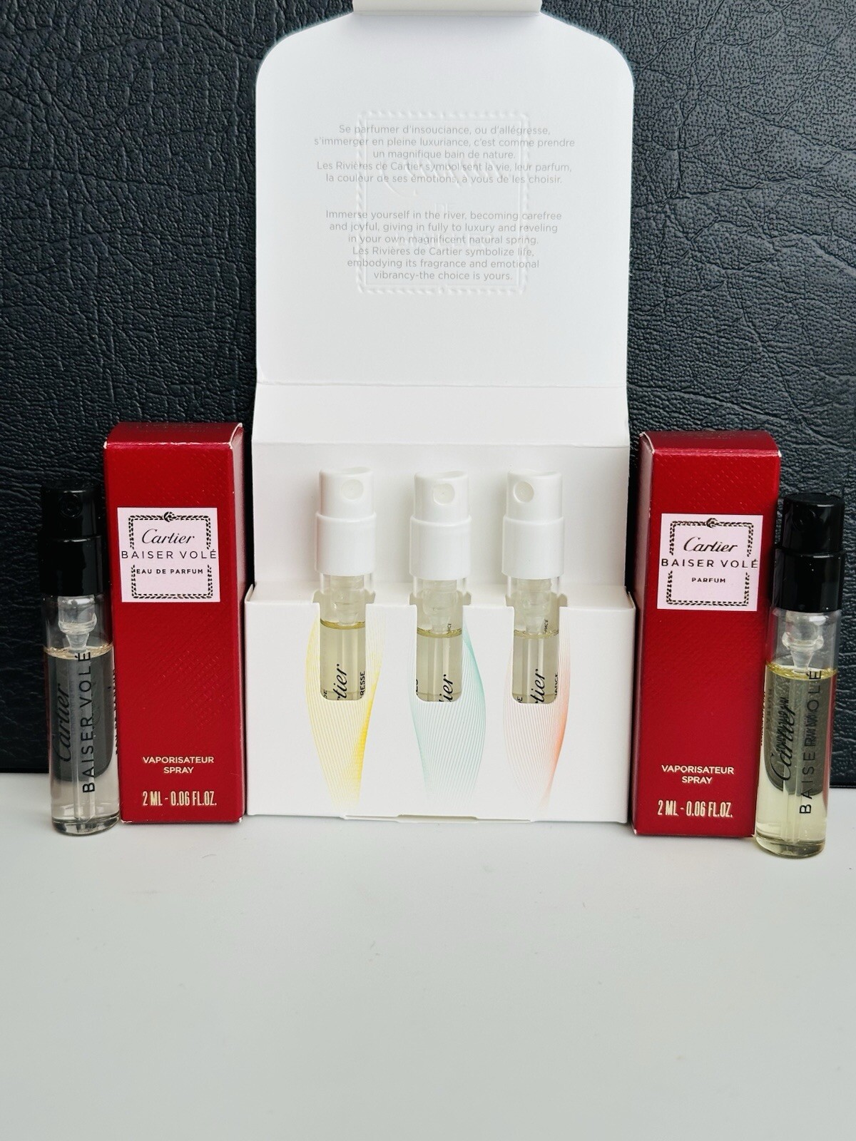 Cartier Collection For Women Sample (5pcs) Brand New, Unused Set Included: - Cartier Baiser Vole EDP Sample 2ml - Cartier Baiser Vole Parfum Sample 2ml - Rivières De Cartier Insouciance sample 1.5ml - Rivières De Cartier Luxuriance sample 1.5ml - Rivières De Cartier Allègresse sample 1.5ml ‼️Note: Manufacturers do not fill up the perfume full on the way to the top‼️