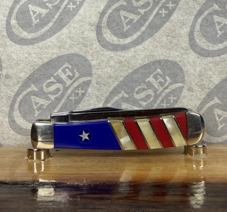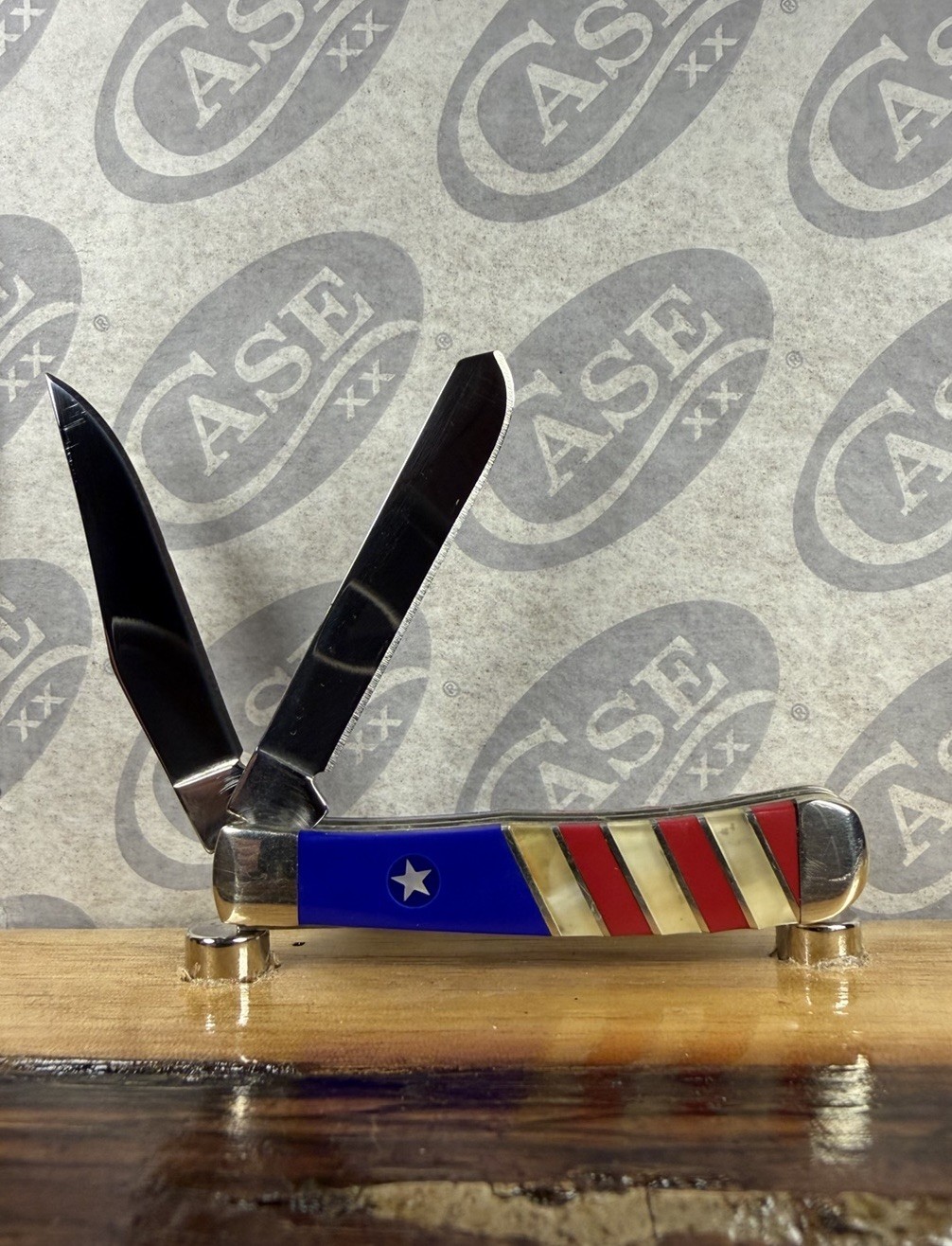The Case XX Exotic Patriotic Tiny Trapper 2008 is a collectible folding knife with a stainless steel blade and a clip point and spey point design. This pocket knife features a manual opening mechanism and a slip joint lock type, making it safe and easy to use. The handle is made of bone and the knife is adorned with red, coral, and blue lapis inserts, adding a patriotic touch to its design. With its under 2.75 inch blade range and ambidextrous dexterity, this original Case XX knife is a unique and collectible piece for knife enthusiasts. Comes with clamshell, but does NOT have the correct sleeve. I’d say the sleeve was mixed up when purchased by the original owner. Please see photos for details and reach out with any questions!